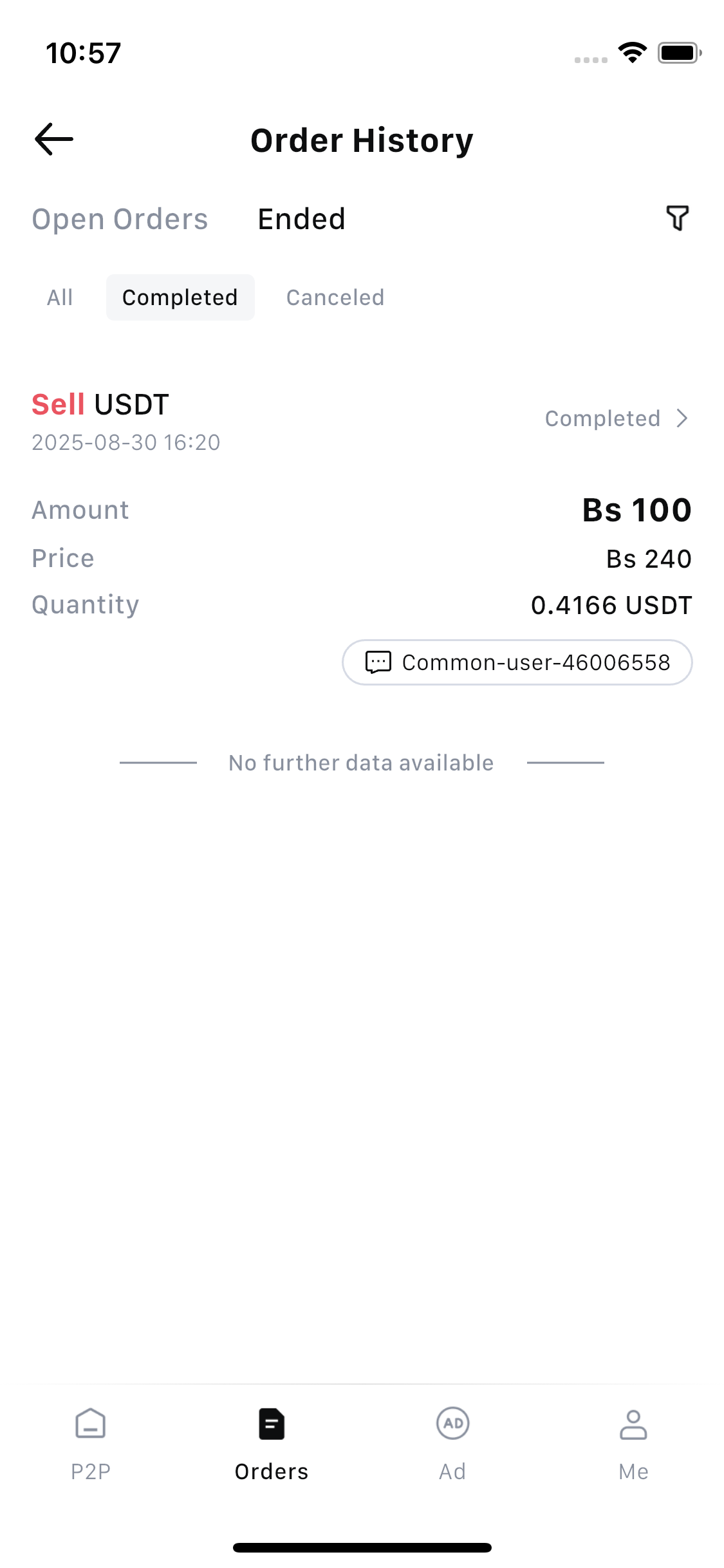 4. Click the Status dropdown and select "Completed" to make sure only finalized trades are shown. You can also filter by date, crypto, or counterparty to locate a specific transaction more quickly.