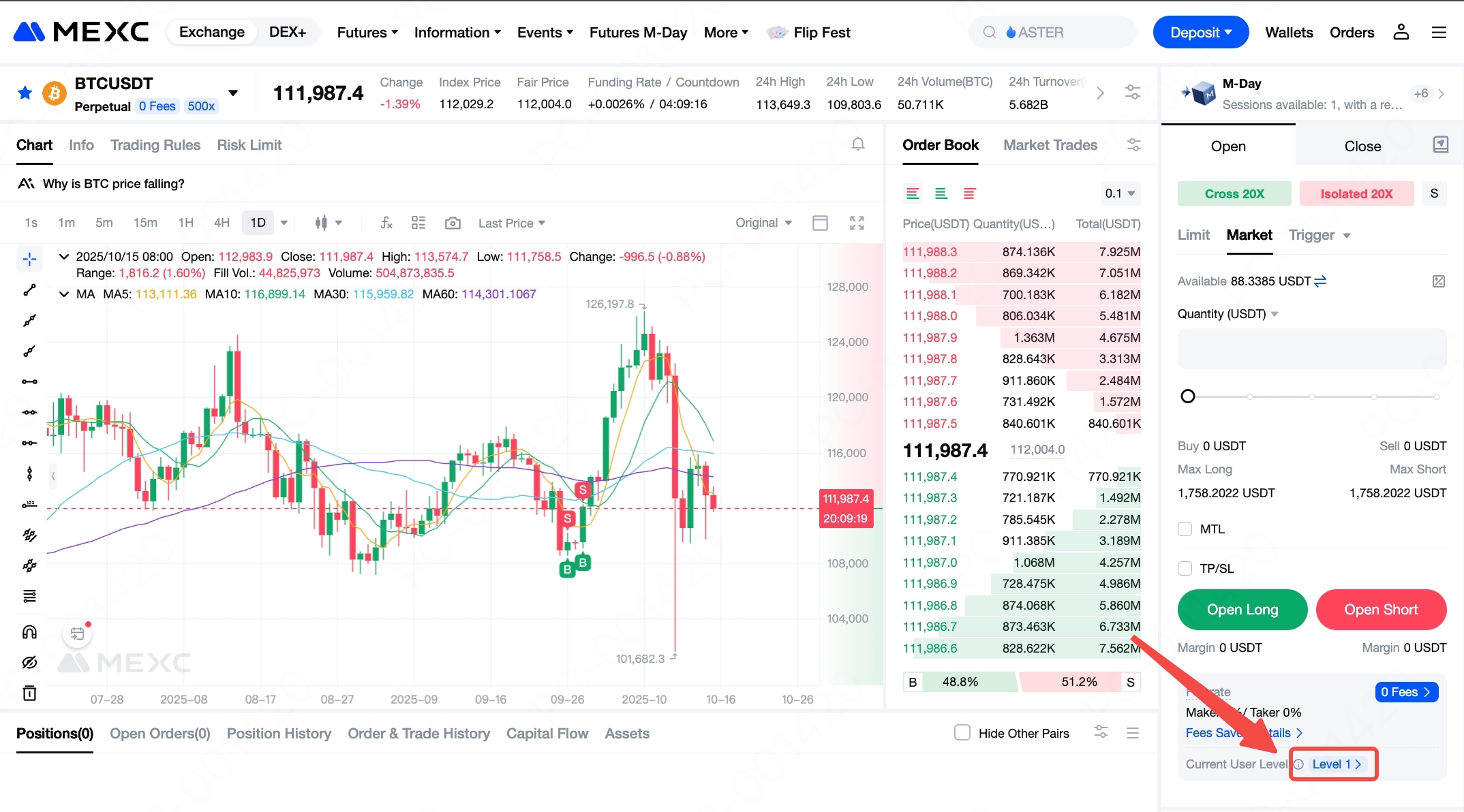 Además, ciertos pares de Futuros Perpetuos de MEXC adoptarán una estructura de tarifas escalonadas diseñada para incentivar el trading activo entre usuarios de distintos niveles. Como las tarifas pueden variar según la región, puedes consultar tu nivel de usuario actual y los niveles de tarifas correspondientes en la página de trading de Futuros. A medida que aumente tu volumen de trading, avanzarás a niveles superiores con tarifas más favorables, mientras sigues beneficiándote de la alta liquidez y la profundidad de mercado de MEXC.