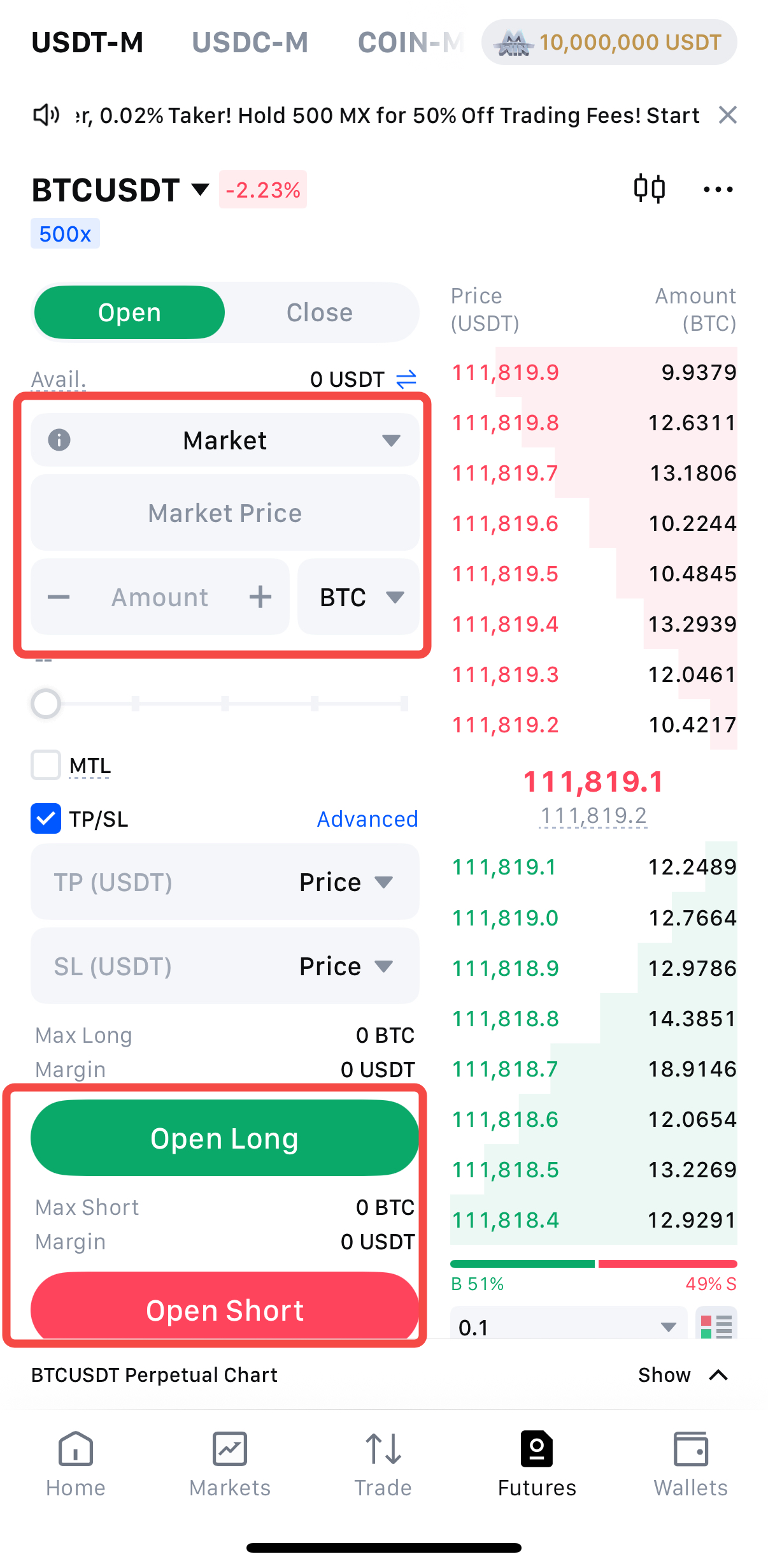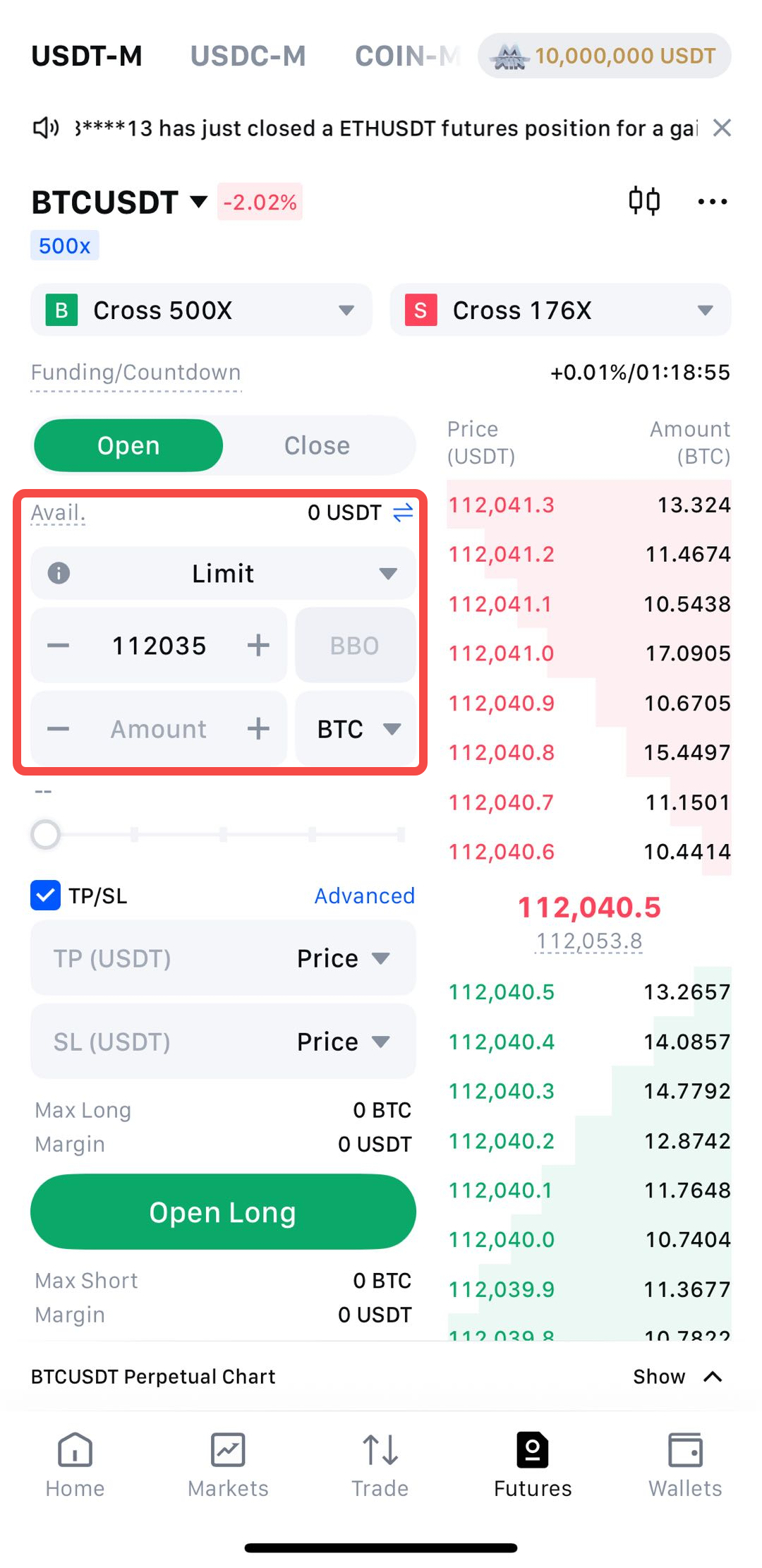 Ejemplo 1: El precio de los futuros perpetuos de BTC supera rápidamente los 40,000 USDT. El trader "A" desea comprar inmediatamente y está dispuesto a aceptar el precio de mercado para abrir una posición. En este caso, puede usar una orden de mercado para comprar.