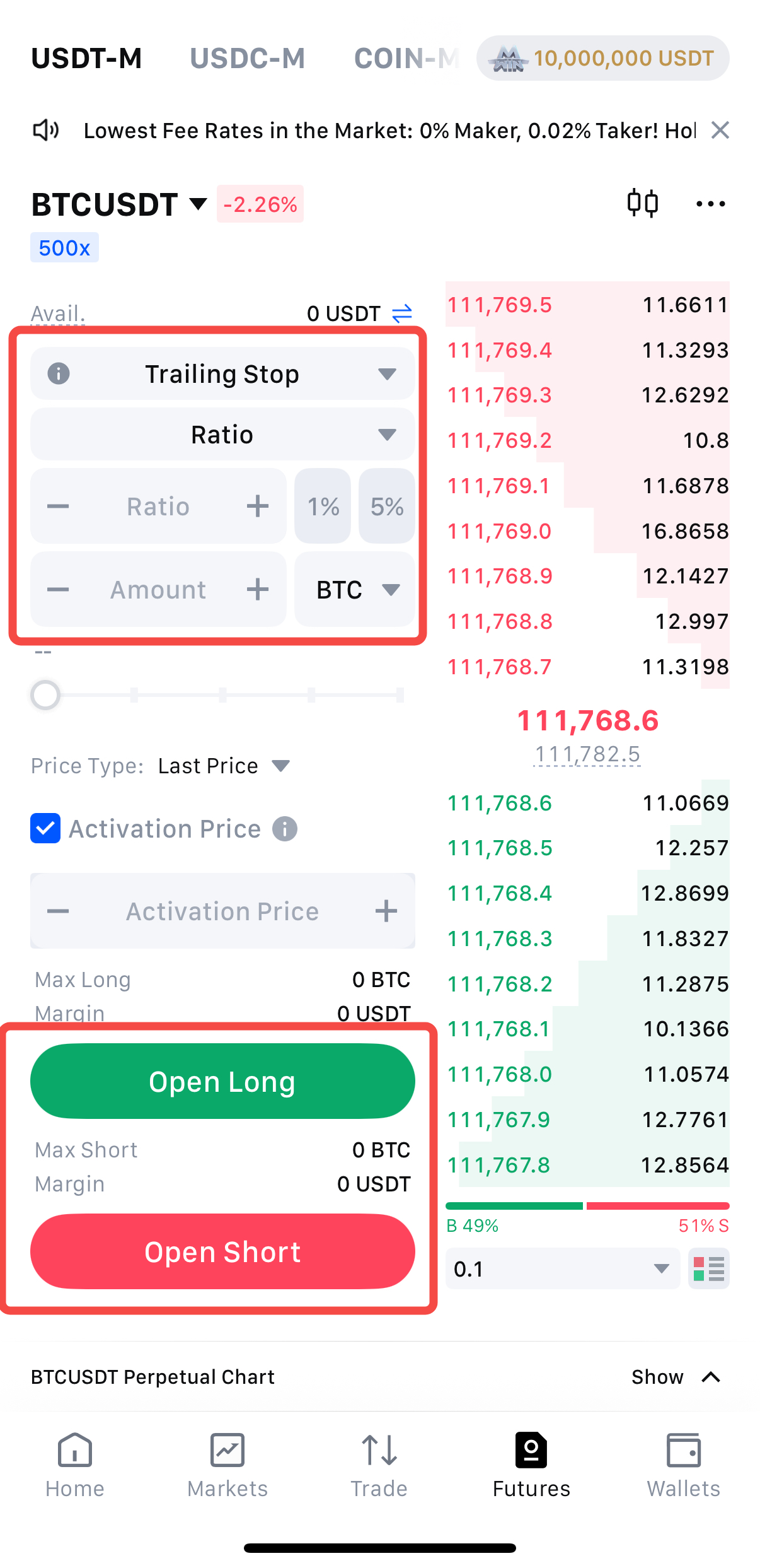 Aplicación: Ingresa a la página de trading de futuros; selecciona Trailing stop; ingresa la Proporción y el Monto; y, luego, toca Abrir long o Abrir short.