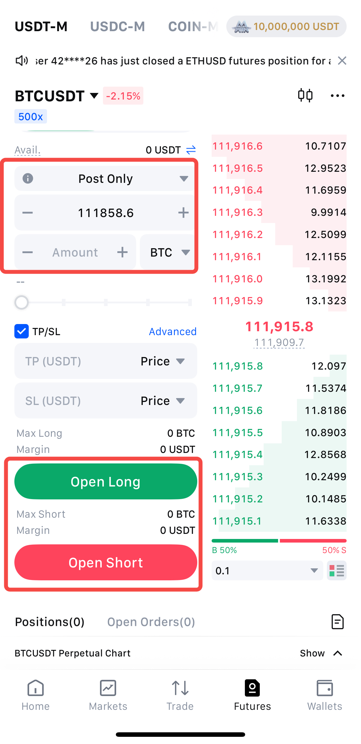 En el sitio web: ve a la página de trading de Futuros, activa el modo de cobertura, selecciona orden límite de seguimiento, establece el precio de seguimiento, ingresa la cantidad y luego haz clic en “Abrir long” o “Abrir short”.