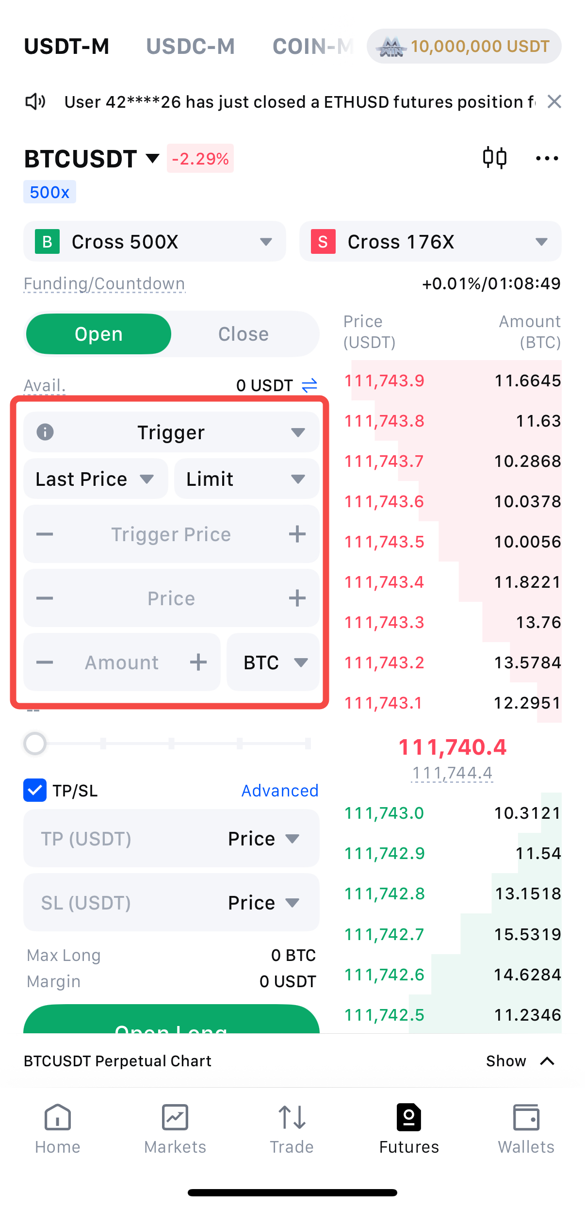 Aplicación: Ve a la página de trading de futuros; selecciona Activación; ingresa el Precio activación, el Precio y el Monto; y, luego, toca Abrir long o Abrir short.