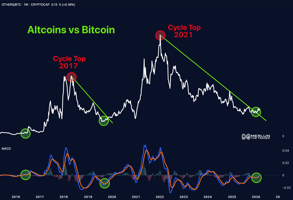Per ora, il grafico ALT/BTC suggerisce che qualcosa potrebbe essere in costruzione, ma la conferma dipenderà dal fatto che il consolidamento evolva in un breakout sostenuto.