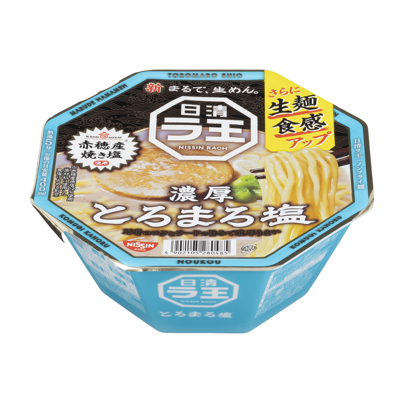 日清食品の「ラ王 とろまろ塩」は、生麺に近い食感を追求したノンフライ中太ストレート麺を使用したカップラーメンです。塩豚骨味の濃厚な白濁系スープには、豚骨のコクとラードの旨み、ニンニクの風味が加わっています。太めでもちもち食感の麺と濃厚なスープが魅力です。試食したモニターからも「ツルッとした麺はもちもちで喉越しがいい」「豚骨は濃厚なのに後味があっさりしていて飽きがこない」といった声が挙がっています。太めの麺にくわえて、大きめのチャーシューも入っており食べ応えも十分です。生麺に近いもちもち麺が魅力の本商品。濃厚な豚骨スープと食べ応えのある麺を求める人におすすめです。