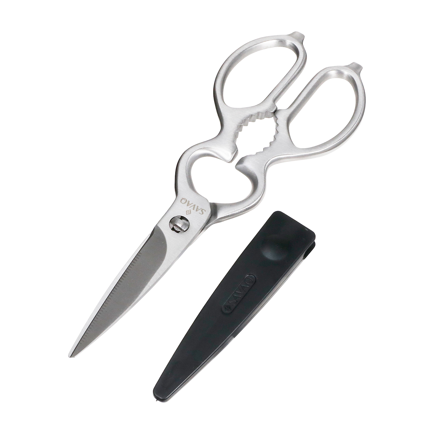独自開発の金型から成型した、ナイトライズの「SAVAQ キッチンバサミ」。刃先を細くすることで軽量化したと謳っています。さまざまな食材をカットしやすく、持ち運びやすいのでシーンを選ばず使えるキッチンバサミといえます。切れ味のよさの検証では、鶏モモ肉の身・皮が1回でスパッと切れ、切り進めやすい点が高く評価されました。昆布も軽い力で切れ、刃の先端まで力が伝わりやすい印象です。モニターからは「柔らかい食材も硬い食材も切りやすい」「力を入れなくても素早く切れる」と、切れ味のよさを実感する声が多く挙がりました。包丁の代わりとして使う分にも申し分なし。手の疲れにくさの検証では、引っかかりがなく、なめらかに開閉できる点が高評価でした。金属製の持ち手でクッション性はないものの、開閉しやすく軽い切り心地なので指への負荷はほとんど感じない印象です。手入れは、分解できて洗いやすい点が好印象。オールステンレス製なので煮沸消毒でき、清潔に使いやすいでしょう。切れ味がよく開閉しやすいため、スムーズにカットできるのが魅力の本商品。手入れもしやすく、ケースつきなのでアウトドアにも持ち出しやすいでしょう。