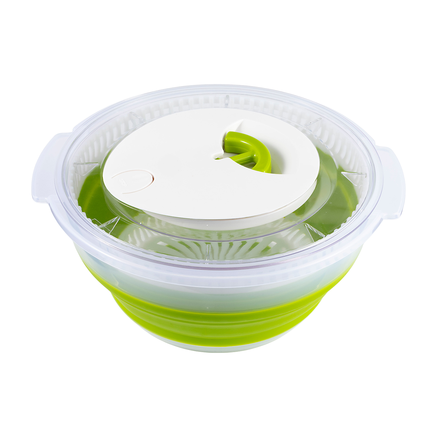 ワイ・ヨットの「365 methods ステンレス サラダスピナー」はステンレス製で、サラダボウルとしても使いたい人におすすめ。スタイリッシュな見た目で、水切り後にそのまま盛りつけられます。肝心の水切れは優秀で、検証では平均77%もの水を切れました。水をしっかり飛ばすことでシャキシャキのサラダが作れるでしょう。フタの開閉がしやすくザルも軽いので、スムーズに水切りできるのも魅力です。ザルの目が細かいため食材を問わず水切りしやすく、モニターからは「何度回しても細かい千切りキャベツが飛び出なかった」と好評でした。フタ裏に凹凸があり、パーツ数が5個と多めなので、手入れの手間は気になるところ。しかし、パーツは分解して洗えるうえに、ボウルのみ食洗機に対応しており、清潔に保ちやすい印象です。本体は折りたためないものの、ハンドルをフラットにすれば高さ12.2cmと小さくなるので、一人暮らし用の小さい冷蔵庫にも収納しやすいでしょう。そのまま冷蔵庫で保存したり食卓に出したりしたい人は検討してみてください。