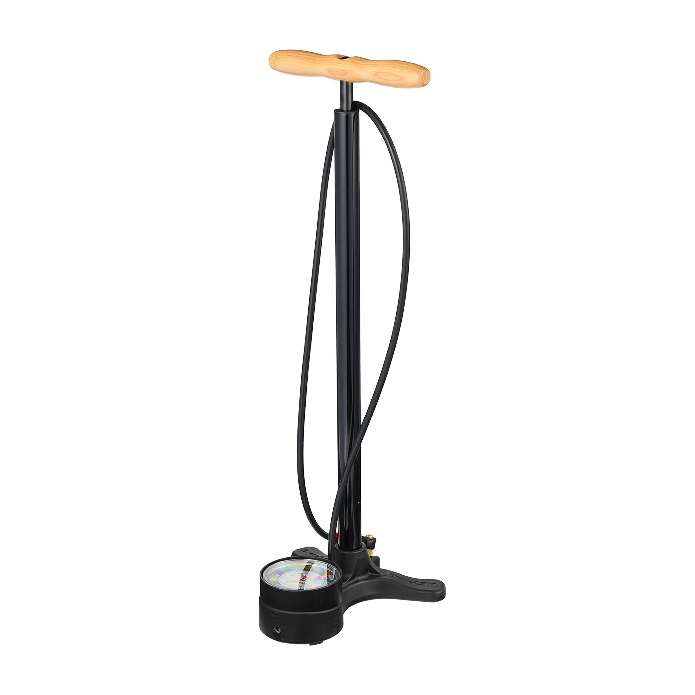 LEZYNEが発売する「SPORT FLOOR DRIVE 3.5」は見やすい大きな空気圧ゲージと、おしゃれな見た目のウッドハンドルが魅力の商品。1ストロークの空気量は実測で310ccと多く、空気を入れる速さは申し分ない結果です。ベースは樹脂製で、ステップ位置がシリンダーの中心よりうしろにあるので若干たわみを感じますが、仮想接地面積が大きいため違和感なく空気を入れやすいでしょう。口金はねじ込み式で、着脱が少し面倒な印象。しかし差し込み式と違い着脱に失敗がなく、空気が漏れることなく確実に取り付けやすい点はメリットです。空気圧ゲージは誤差±1.25%と若干正確さに欠ける点はネック。精緻な空気圧管理に向いているとはいえないでしょう。一般的なフロアポンプなので持ち運びに向いた商品ではありませんが、電動ポンプのようなうるささはなく、充電の手間はありません。