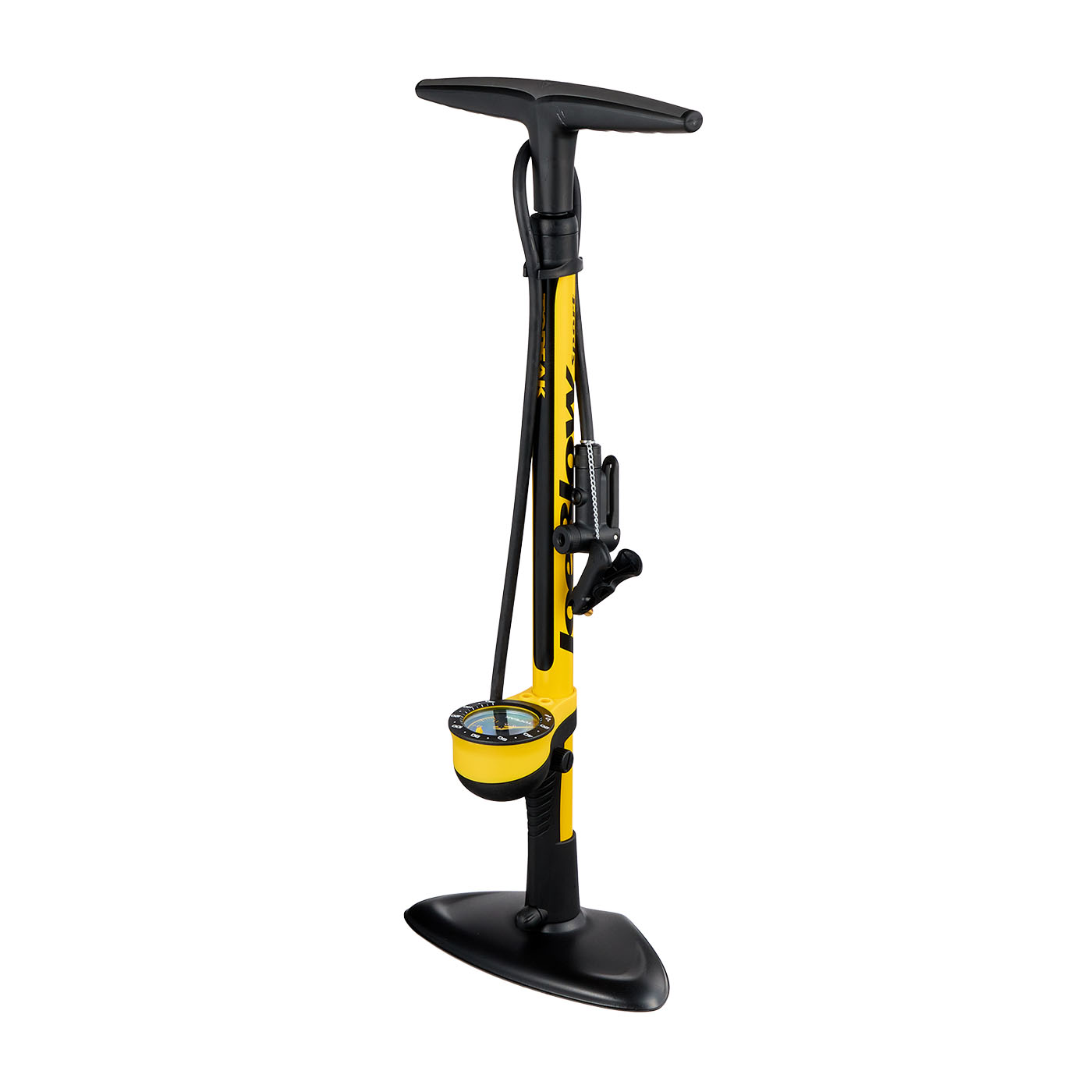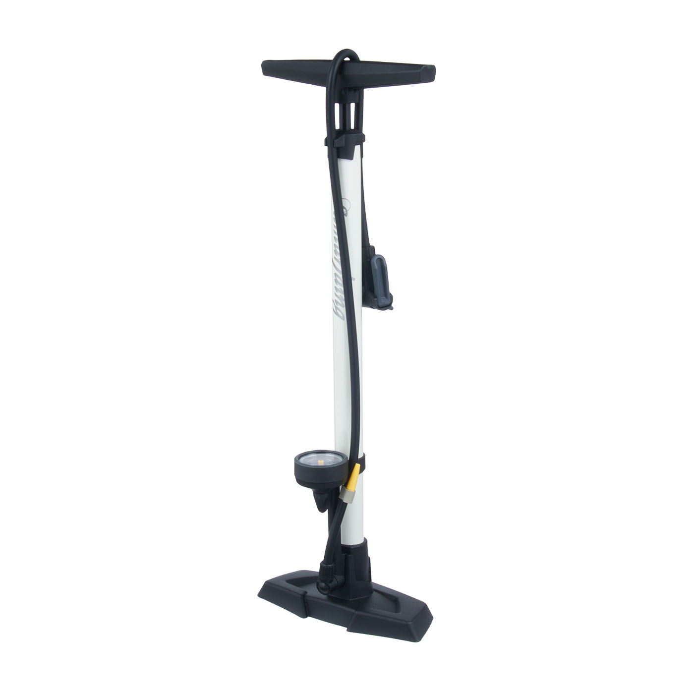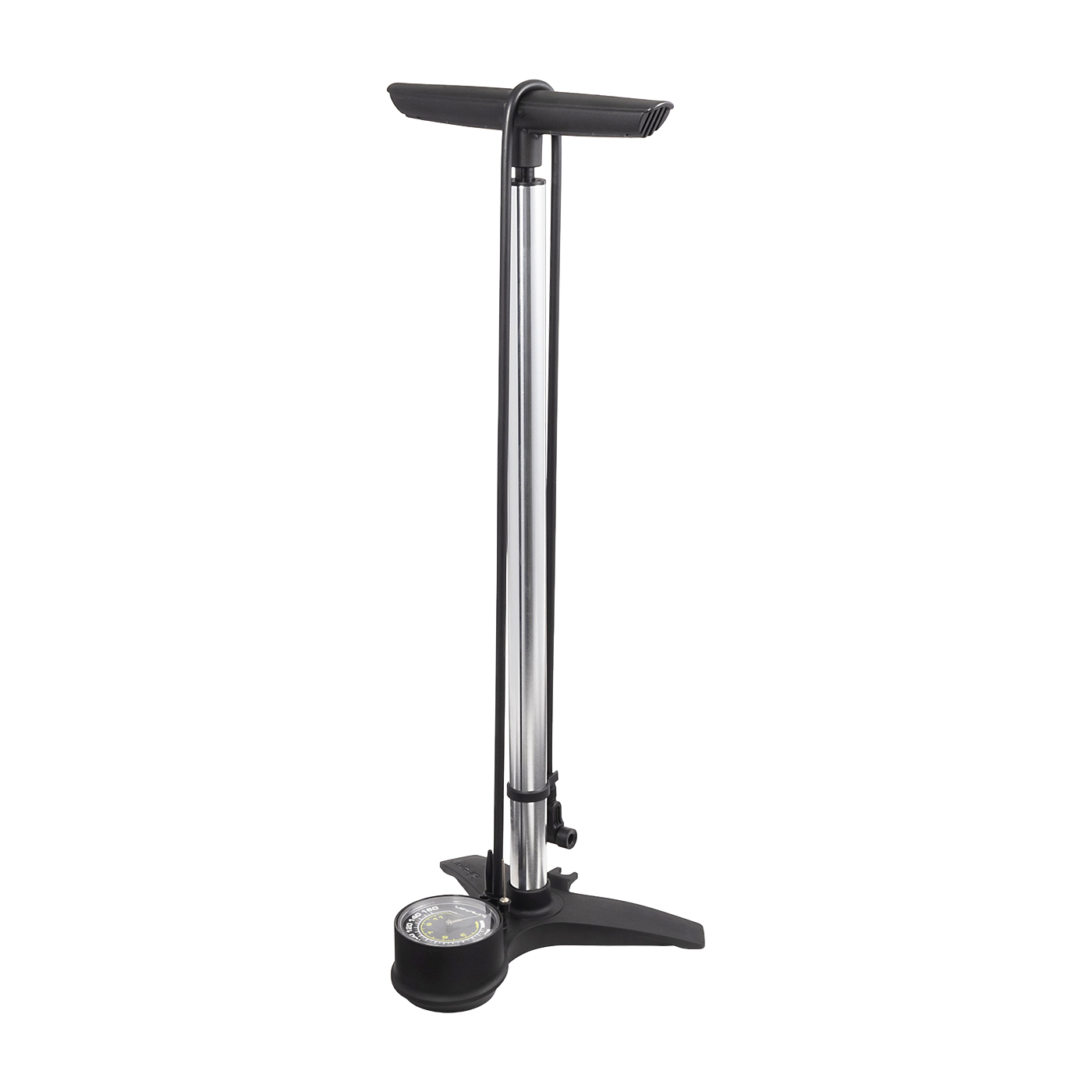 Birzmanの「The Pump with Flick-It」は、CNC切削で仕上げられたボディが特徴。口金は切り替え不要で仏式バルブと米式バルブに対応します。1ストローク当たりの空気量が多く空気を入れる速さの検証は高評価。素早く空気を入れられるでしょう。力の入れやすさも満足とはいかないものの、大きめのベースを備えているため安定感が高い印象でした。口金は差し込みタイプで、レバーを操作してバルブへの固定ができます。口金をバルブへ押し付ける際に力が必要である点はネックですが、操作は簡単にできるでしょう。一方で空気圧ゲージの誤差が±5.02%と大きく、あまり正確とはいえない点は気になるところ。正確な空気圧管理をする場合は別の空気圧ゲージをつかうのがおすすめ。一般的なフロアポンプであるため持ち運びに適した商品ではありませんが、電動ポンプのように騒音やバッテリー切れに悩まされない点はうれしいポイントです。