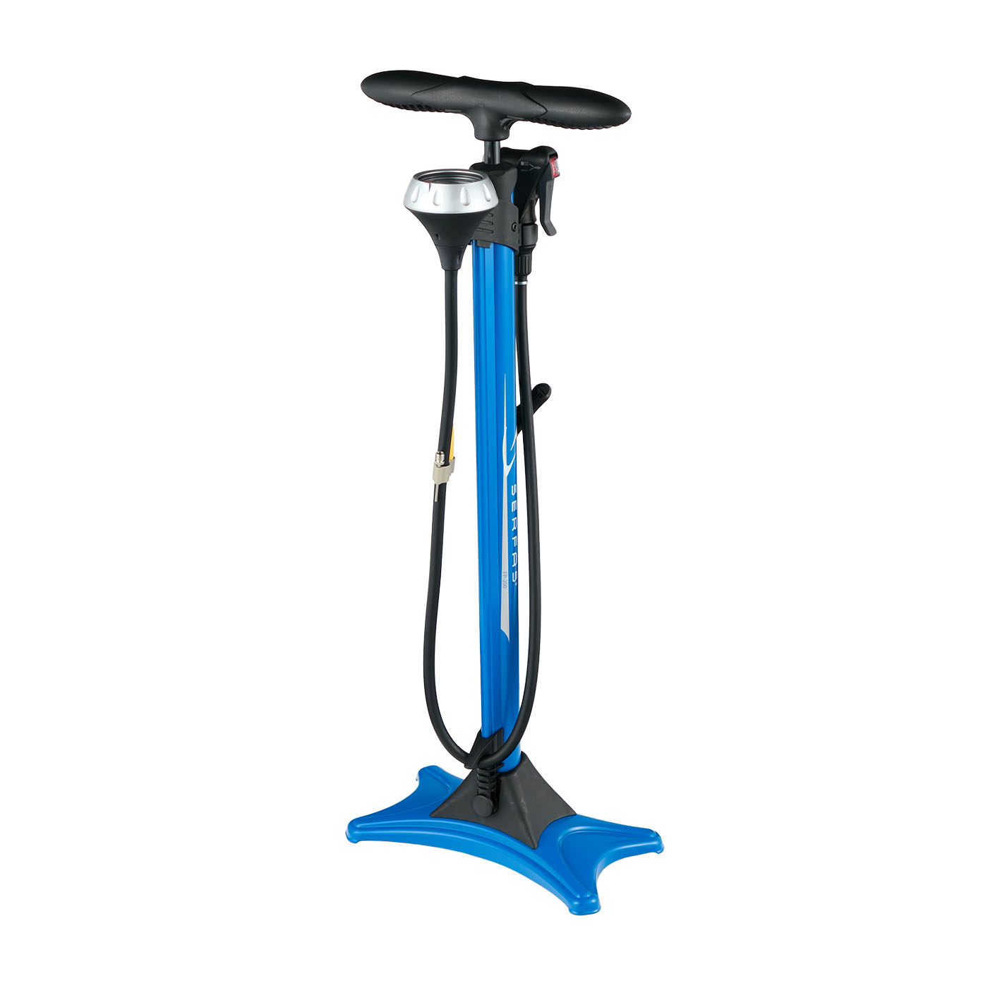 SERFASの「フロアポンプ FP-200」は5種類の豊富なカラーラインナップが魅力の商品です。1ストロークの空気量は実測で285ccと標準的で、空気を入れる速さは十分といえるでしょう。ベースには金属製のものを採用しており、ポンピング時のたわみが少なく力が入れやすい点はうれしいポイントです。口金には差し込みタイプを採用しており、レバーを操作することでバルブへの着脱が簡単にできます。しかしレバーの操作感は少し固めで、操作にやや力が必要な印象です。空気圧ゲージの誤差は±0.5%以下と非常に正確でした。精緻な空気圧管理がしやすいといえるでしょう。一般的なフロアポンプなので持ち運びに適した商品ではありませんが、電動ポンプのように騒音が気になることはなく、バッテリーが切れる心配もありません。