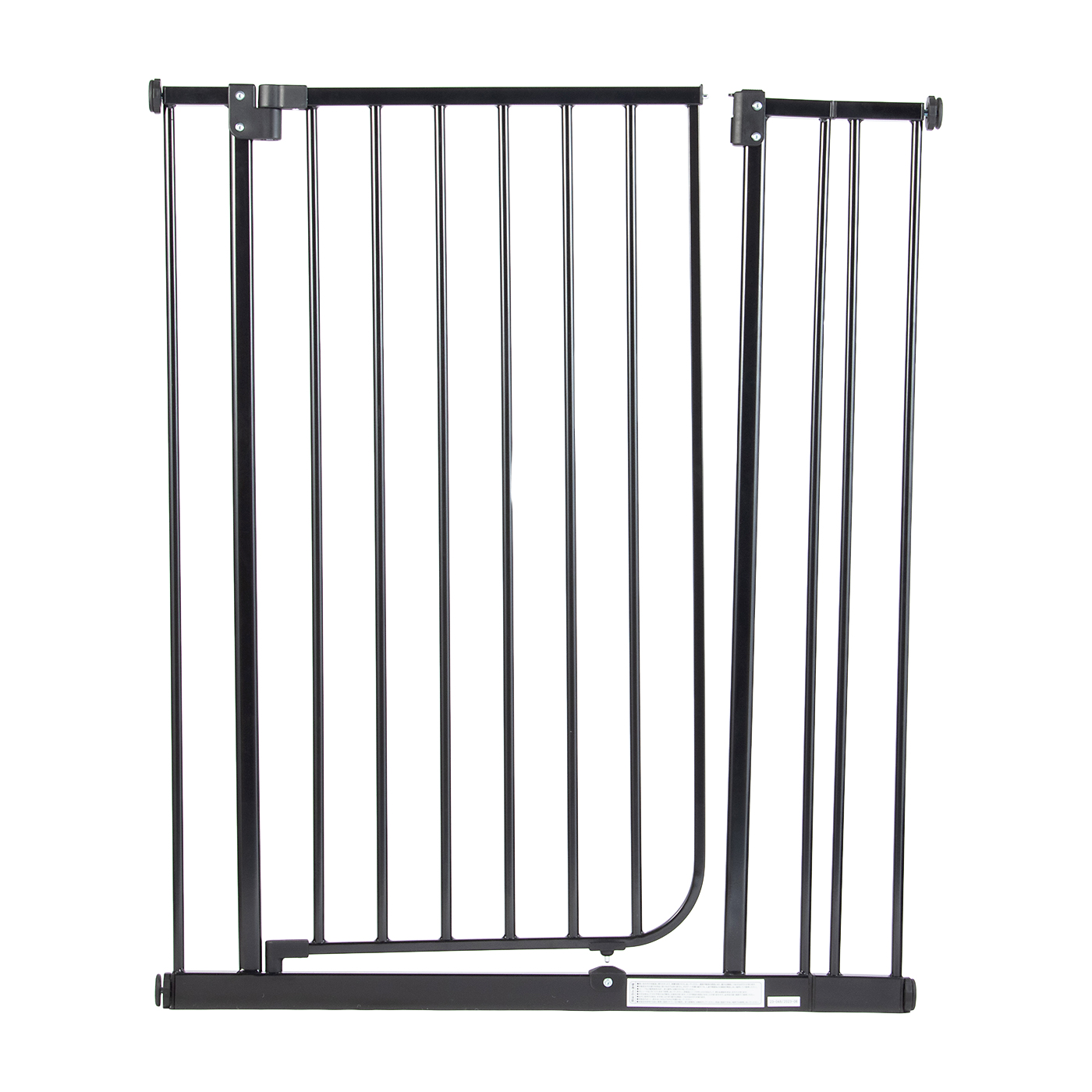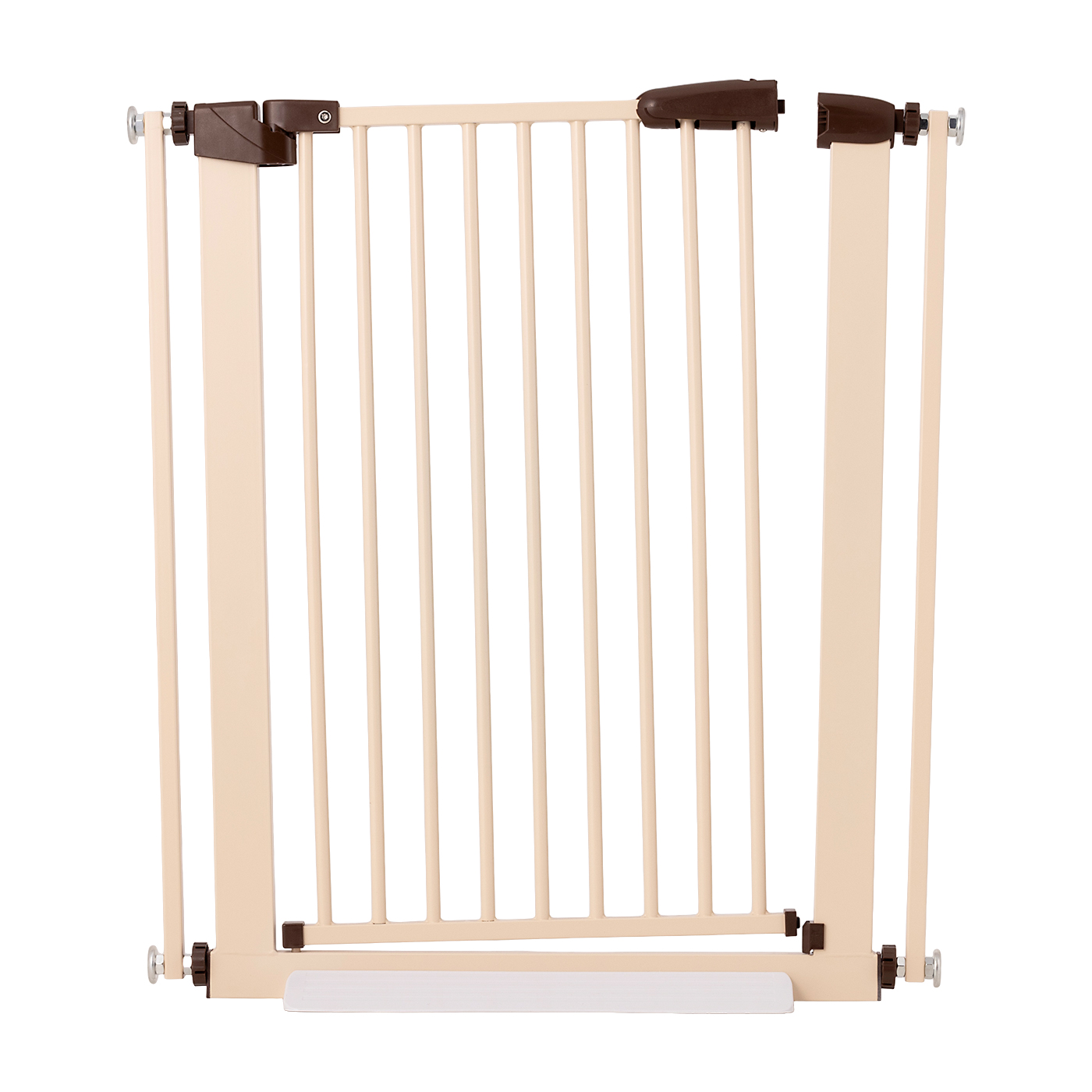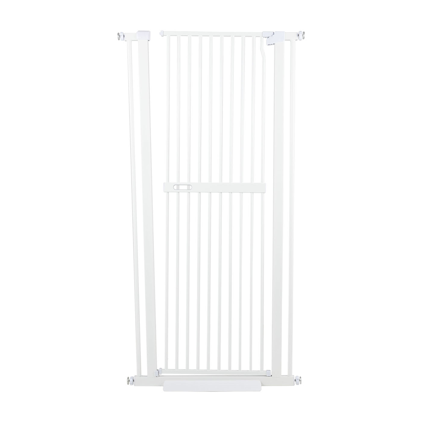 「スチールゲート 拡張フレームつき」は子育て用品や収納グッズも取り扱うシンセーインターナショナルの商品。拡張フレームが1枚付属しており、取りつけ幅の調節が可能な商品です。前後どちらにも扉が開くうえ、ロックの解除を片手で簡単に行えました。荷物を持っているときや、犬を抱っこしているときも楽に出入りできるでしょう。ただし、足もとには約3cmの段差があり、通る際には気をつける必要があります。また、組み立てる必要がなく壁に突っ張らせるだけと設置も簡単。付属の専用工具を使うことで突っ張り器具もスムーズに締められました。きつく突っ張れるため小型・中型犬の力では倒れる心配は少ないといえるでしょう。加えて、ダブルロック機能つきでロックを解除される心配は少ないうえ、手を離すと勝手に閉まるオートクローズ機能もついています。しかし一方で、高さは78.0cmとやや低め。トイプードルやテリアのような脚力の高い犬種が飛び越える懸念が残る印象です。使う際はしつけをしたうえで使うようにしましょう。