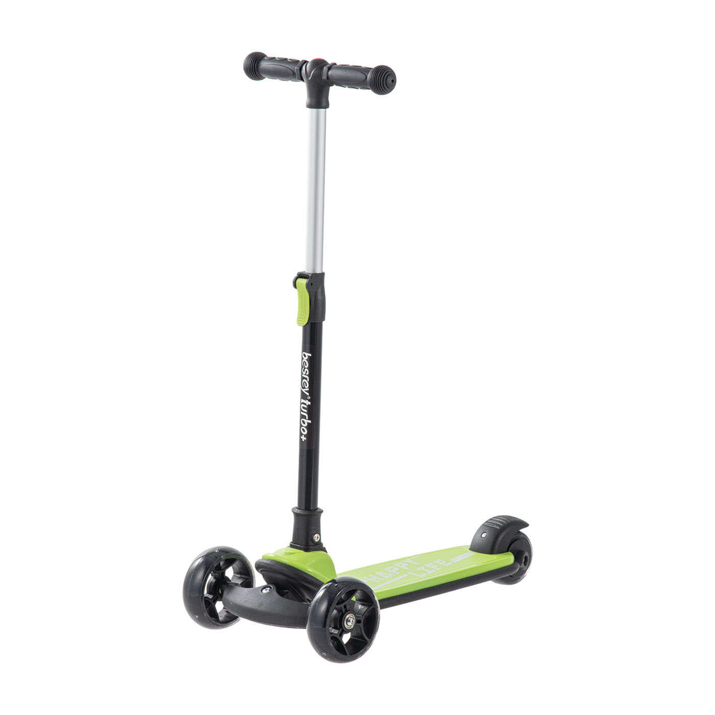 besreyの「キッズスクーター」は、自転車に乗るのが難しく、2輪タイプだと不安な子どもにおすすめ。検証した3輪タイプのなかでは、走行時の安定感の評価が最もよい結果でした。ハンドルとデッキを接続した部分がガタつきにくく、前輪同士の距離も十分にあるため、遅いスピードで走る場合は大きくブレずに走行できます。デッキ自体もフラットで足をのせやすい印象です。しかし、デッキに滑り止めがないため、滑りにくい材質の靴を履いて使いましょう。折りたたみ・組み立てがしやすいのも魅力。レバーに指をひっかけやすく手軽に操作できます。スタンドはありませんが3輪で自立するため、どこに置いても倒れる心配はないでしょう。サイズ調整は有段階で、無段階で高さを選べる商品には劣ります。とはいえ、ハンドルの高さは最大80.7cm(実測値)まで変えられ、3輪を使う子どもの体格には十分対応できるでしょう。前輪と後輪についた電飾は、3色で光るため薄暗くなり始めた夕方でも存在感を発揮します。安定性・取り回しやすさ・電飾の豊富さなど、子どもにとって必要な要素を兼ね備えたアイテム。3輪タイプを探している場合はぜひ検討してください。