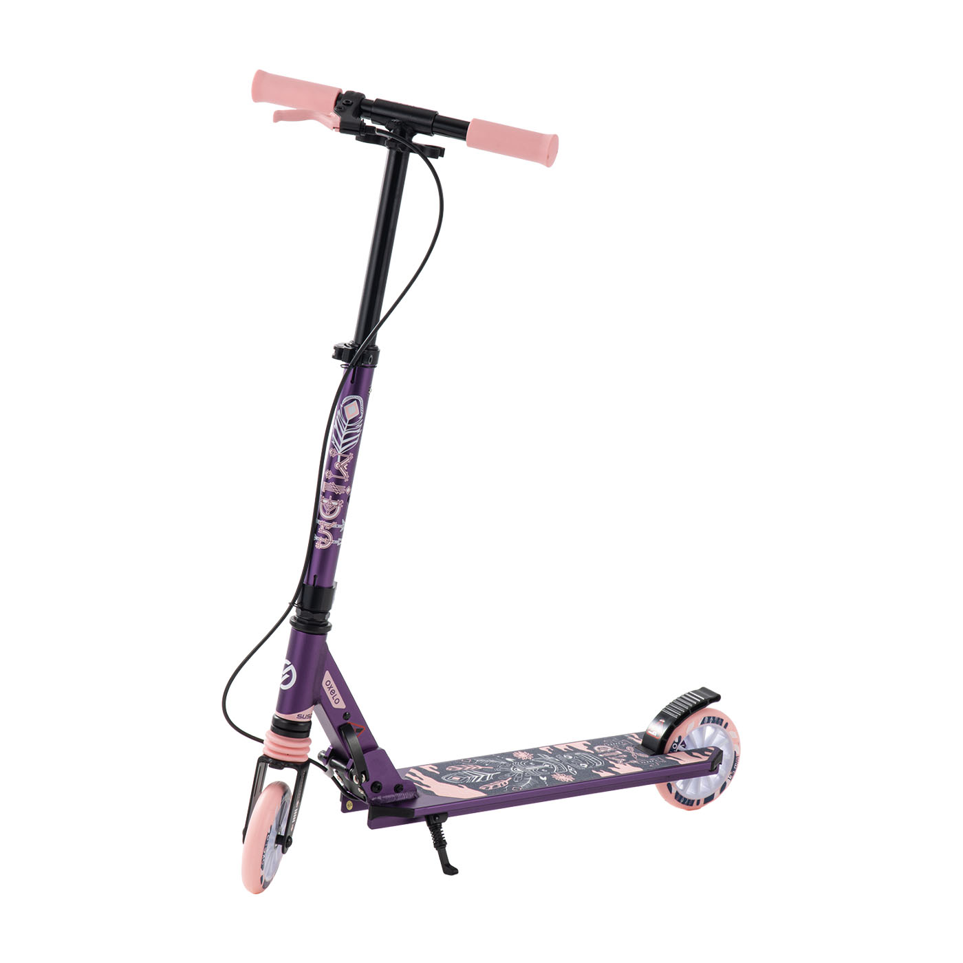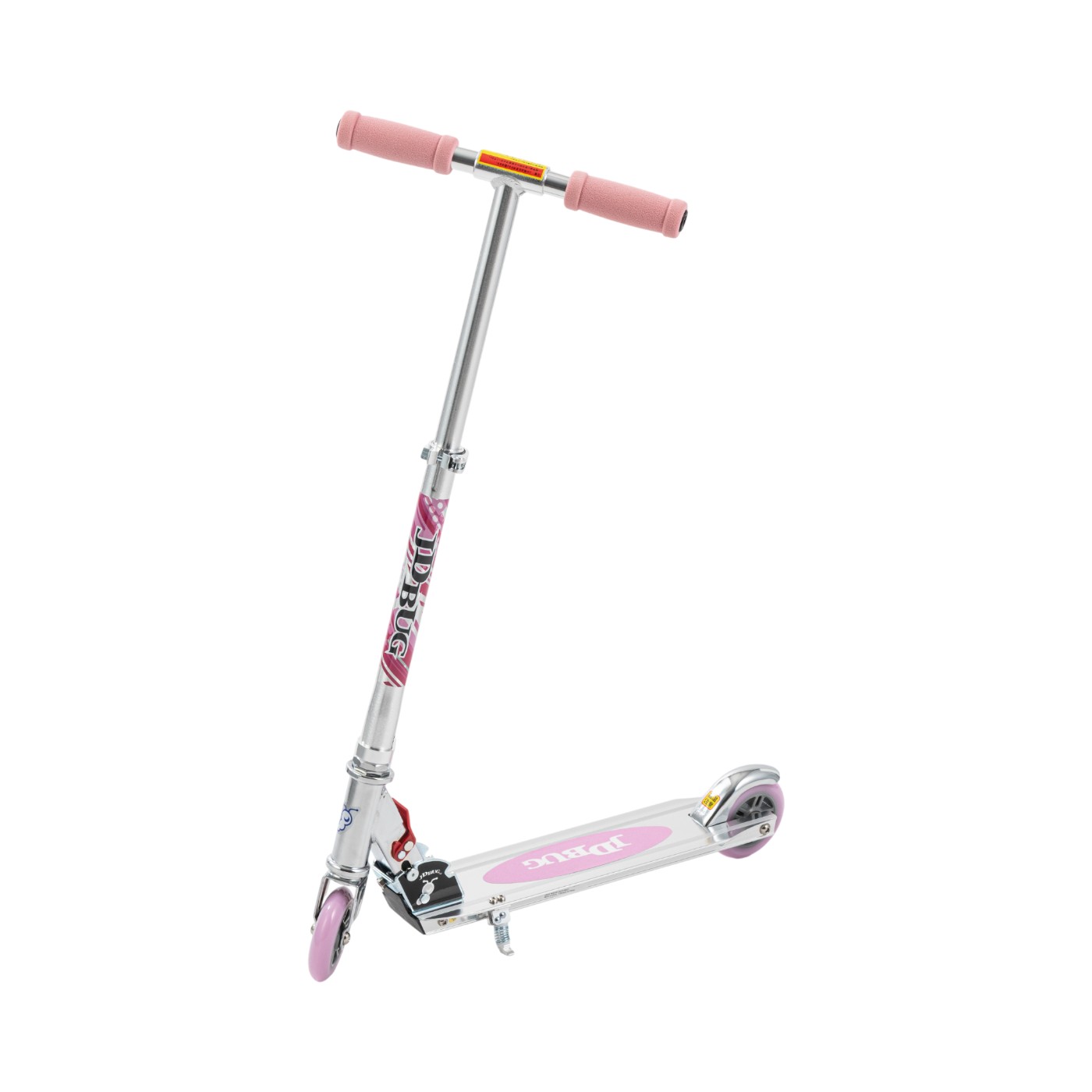 ジェイディジャパンの「JD Razor JD Razor MS-105RB」は、かわいらしいデザインを重視したい人にぴったり。ハートがあしらわれたデザインのラインナップが豊富で、人気者になれそうな印象です。デザインだけでなく走りやすいのもポイント。ハンドルとデッキを接続した部分のガタつきが少なく、足をのせるデッキの高さが比較的低めで、グラグラしにくい設計です。ただし、前輪に繋がっているハンドブレーキのブレーキ力が強すぎるため、急ブレーキをかけると前輪がロックして前転する危険性がある点に注意しましょう。レバーに指を引っ掛けやすく、スムーズに折りたたみやすいのは魅力です。ただし、自立せずスタンドもついていないため、場所によっては使いづらいこともあるでしょう。サイズは調整しやすく、子どもの成長に対応できます。無段階で調節できるハンドルは最大85cm(実測値)の高さになるため、体格に合わせて長く使えるでしょう。前輪には3色の電飾がついており、遠くに行かなければ、夜間でも見つけやすそうです。基本性能と見た目のバランスが取れた子ども用キックボード。ほかにはない、かわいらしいデザインにこだわるならぜひ検討してください。