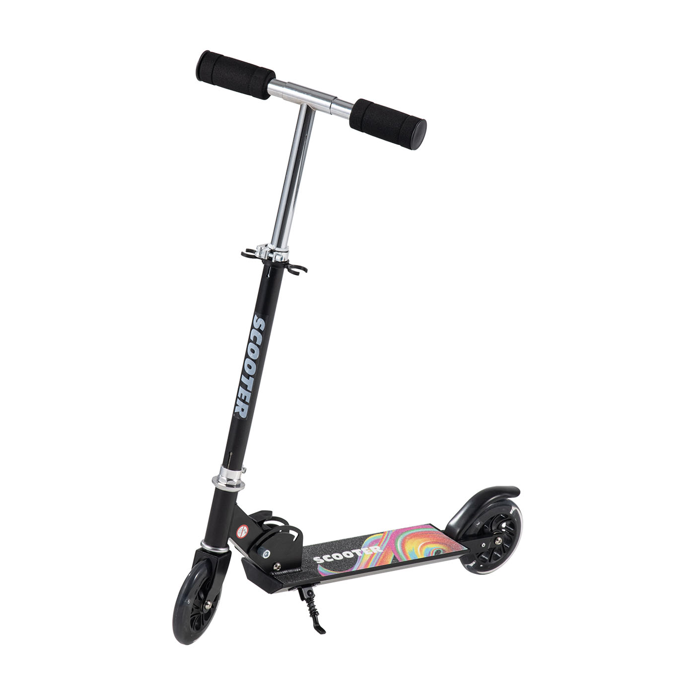 日本トイザらスの「折りたたみアルミニウムスクーター」は、全国のトイザらスで販売されているため、実店舗で実物のサイズや乗り心地を試せるのがメリット。本体のサイズは子どもの成長に合わせて柔軟に調整できます。段階はありますが、ハンドルの高さを最大83.5cm(実測値)まで伸ばせるため、兄弟・姉妹でもシェアしやすいでしょう。しかし走行時の安定感は高いとはいえません。車輪間の距離が大きめで安定感が期待できるものの、ハンドル・デッキの接続部のガタつきが大きく、体重をかけるとバランスを崩す可能性があるといえます。レバーに指をひっかけにくく、折りたたむ際も操作しづらい印象。また、スタンドがなく自立もしないため、保管時にはどこかへ立てかけておく必要があります。ふとした拍子に倒れて傷がつくのを防ぐため、滑りにくい壁際を選ぶなど保管場所の工夫が欠かせません。実物を見て納得してから買いたい人や、一台を複数人で使いまわしたい人なら検討の余地があるでしょう。