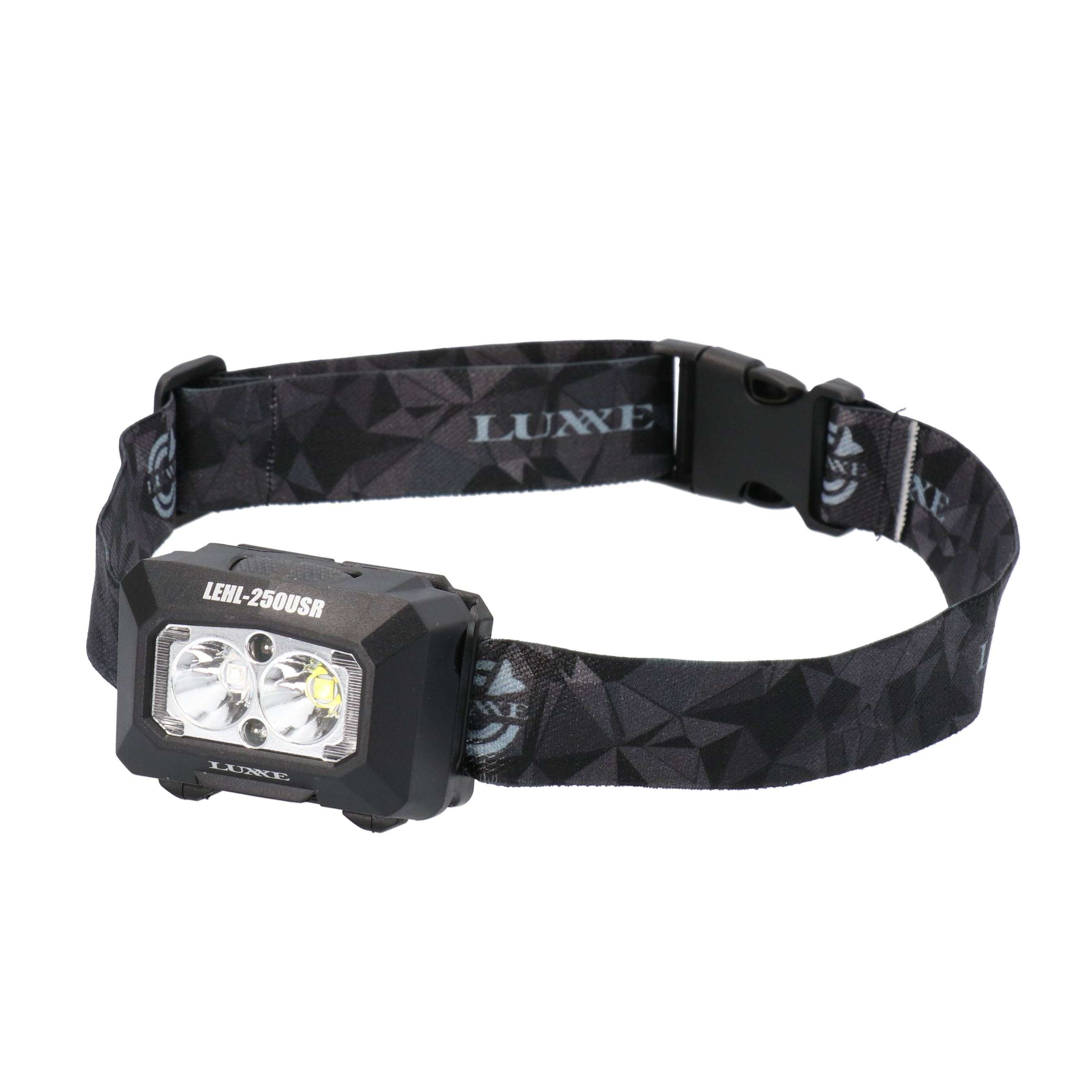 磯釣り界隈において不動の人気を誇る、がまかつの「ヘッド & ネックライト LEHL250USR」。がまかつのライトゲーム専用ブランドが手掛ける、アジングのワームを光らせたいときにうれしいUVライトを搭載したモデルです。明るさの検証は、スポット・ワイドモードがないため、1つの白色LEDの最大光量で実施。スポットモードの検証における14m先の中心は、良好な明るさがありました。ワイドモードの検証での中心から4m横の明るさは、それよりも低い結果となりました。光量は3段階の強さから調節する段階式です。サブスイッチがついており、UVライトと2種類の赤色LEDを使い分けられます。防水性能はIPX4で、波しぶき程度なら問題なく使えるでしょう。そのほかのロック機能や後部認識灯などの機能はありません。1回スイッチを押すだけで消灯できるので、不用意に釣り場を照らしたくないときに活躍するでしょう。再度点けると同じ明るさで使えるメモリー機能付きで、電球の色を選びなおす手間もかかりません。電池は充電池が内蔵されており、Micro USB Type-Bで充電します。小さなサイズのため、頭をふってもほとんどずれず一体感がありました。一方、ベルトの締め付けが強くライトの裏も当たる感覚があるので、異物感があるとの声も。電池のもちを最大光量モードで検証したところ、約4.9時間と短い結果に。こまめに消灯し、釣行ごとに忘れずに充電することを推奨します。