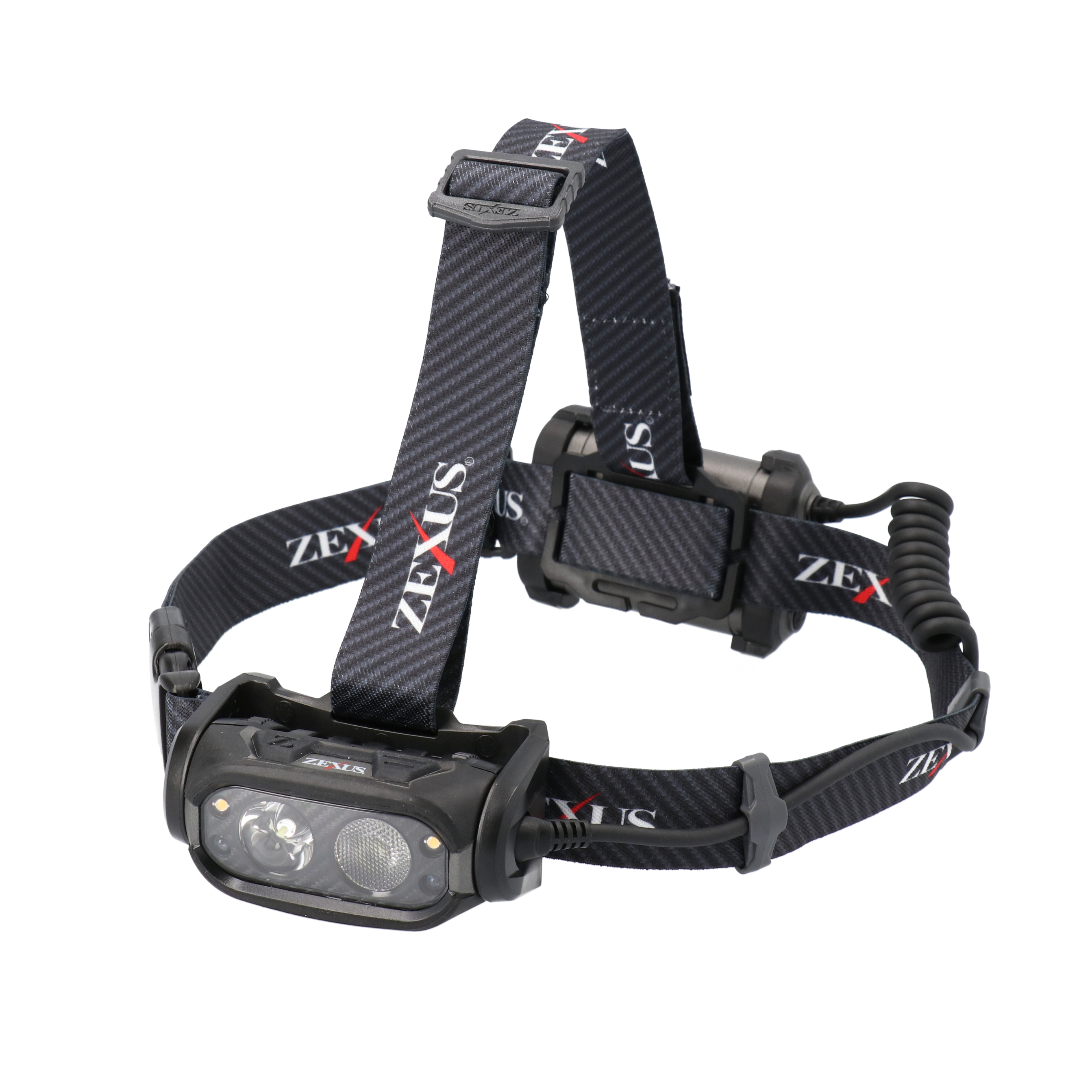 釣り専用設計のライトを販売する大手メーカー、富士灯器の「ゼクサス ZX-R730 (充電タイプ)」。同社のなかではハイエンドに位置し、約1,200ルーメンの白色LEDを搭載したフォーカス機能付きモデルです。モバイルバッテリーとしても使える、専用充電池が付属します。非常に明るい白色LEDで、スポットモードでは14m先をしっかりと照らせました。とくに、ワイドモードの明るさに優れ、広範囲をくっきりと照らせて高評価に。フォーカスでモードを切り替えるタイプで、赤いリングで調節します。光量はスイッチを長押しして無段階で調節できるので、自分好みの光量で使用可能。光量が最大・最小に達すると点滅して知らせる機能付きです。サブライトには赤色LED・電球色を搭載しているので、魚に警戒心をあまり与えずに手元の作業ができるでしょう。電池部には後部認識灯がついているので、消灯していても周りに自分の位置を知らせられます。使い勝手では満点の評価を獲得。スイッチを1回押すだけで消灯できるので、魚を驚かさないように素早く消したいときに役立ちます。また、消灯しても同じ明るさで使えるメモリー機能がついているので、光量やモードを選びなおす手間がかかりません。充電はスマホと同じ、Micro USB Type-Bで充電できます。一方、ライトの裏に多少のカーブがついているものの、おでこへの感触は硬い印象です。ベルト3本で頭部をホールドしますが、つるつるとした素材のためずれやすいとの声が集まりました。ライトと電池部のパーツはともに大型で、重量感もあります。電池のもちの検証では、充電池式でありながら最大光量モードで約55時間点灯し続けました。今回検証した充電池式のなかではトップクラスで、長時間使用できる性能があるといえます。明るい電球をフォーカスで使い分けたい人におすすめの、夜釣りを快適にする工夫に富んだ商品です。