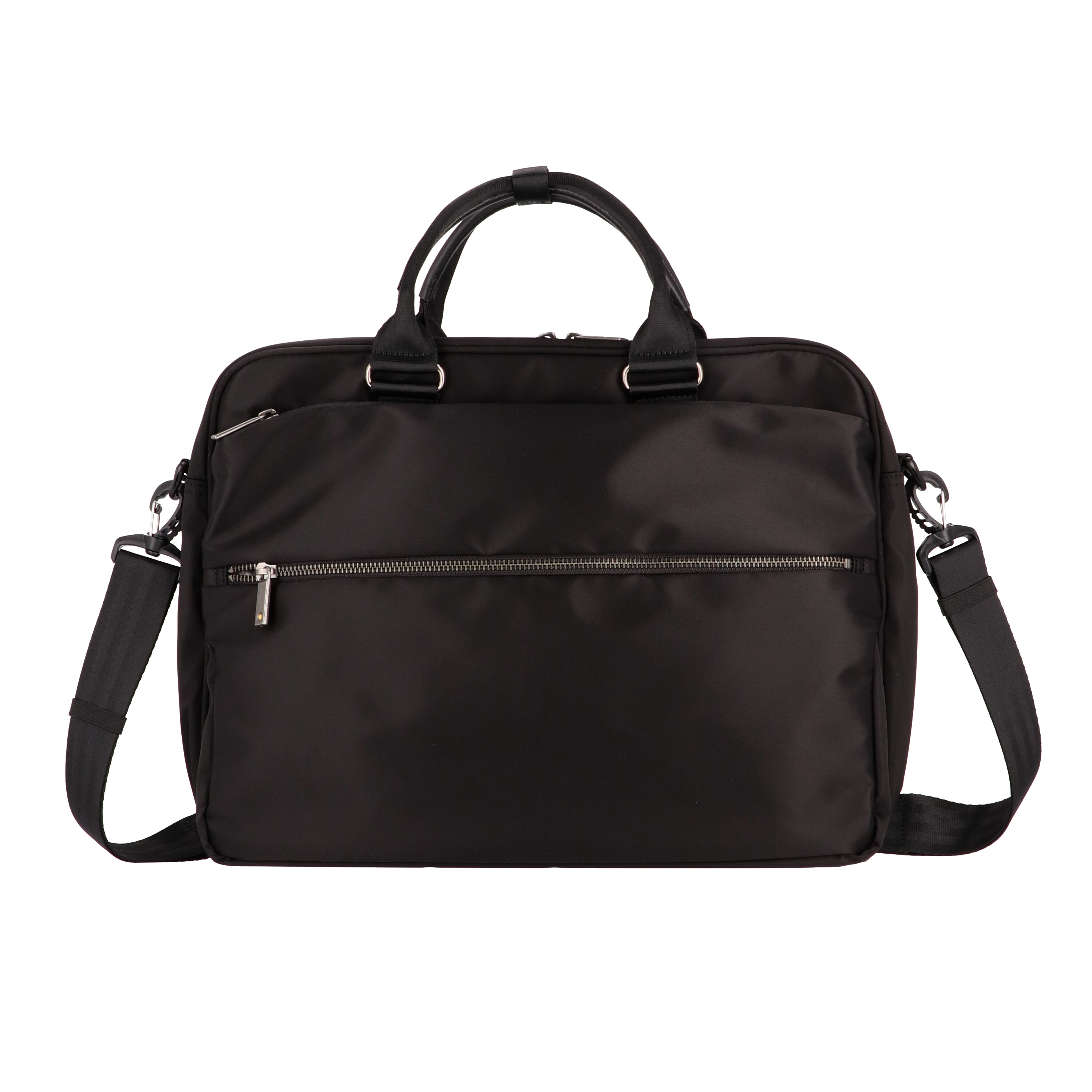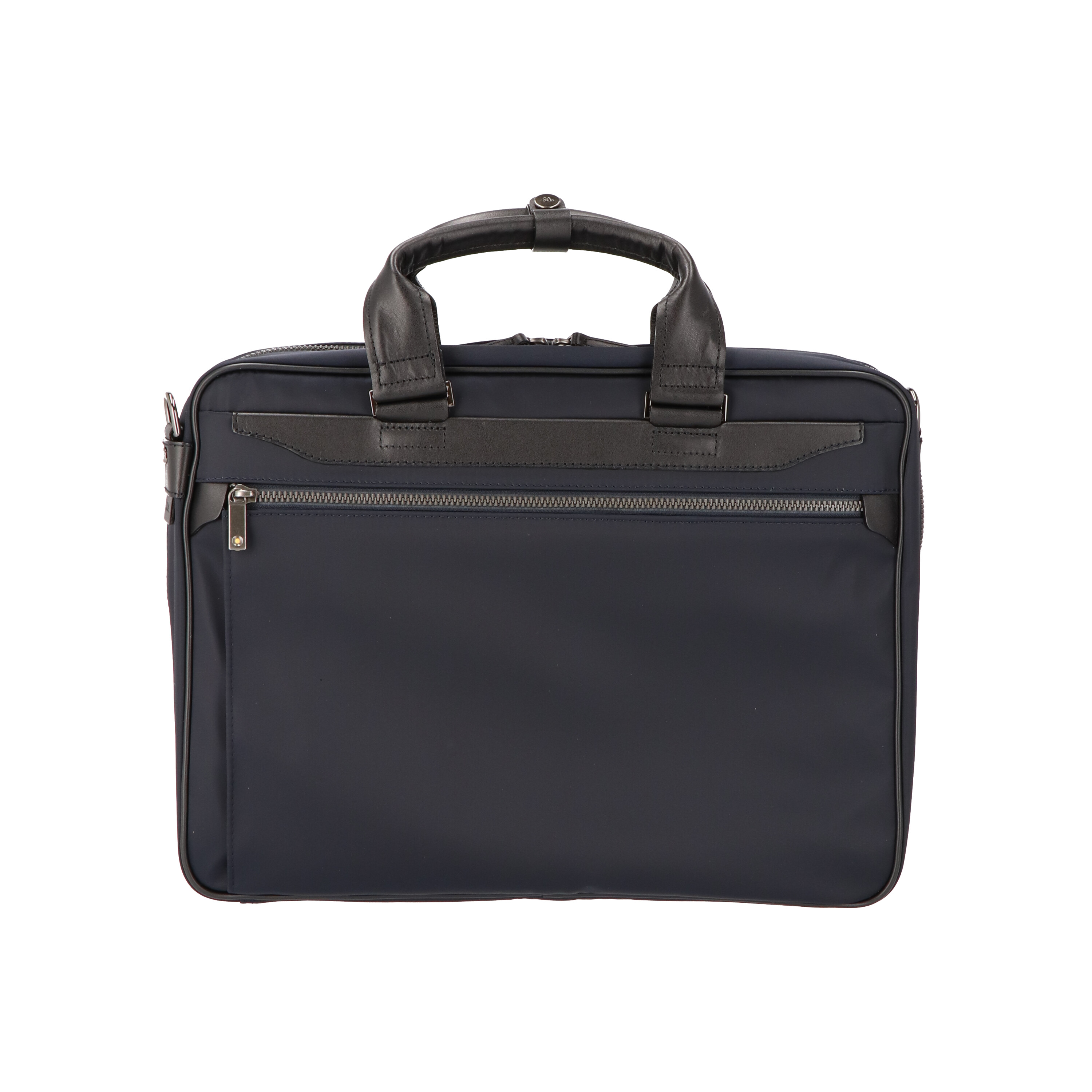 ace.の「プロフレックス ブリーフケース」は、ポケットに抗ウイルス・抗菌加工が施された生地が用いられているのが特徴。本体側面にも持ち手が備え付けられているので、電車の網棚に置いても取りやすいのが便利なポイントです。持ち手がレザー調でなじみがよく、クッション性もあり持っていてほとんど負担を感じませんでした。通勤時間が長い人や、1日中外回りをする営業職の人にぴったりです。光沢のあるサテン生地は高密度に織られており、強度は申し分ありません。ファスナーの滑りもよく、細かいパーツまで質のよいつくりといえます。防水性の検証では、シャワーの水をかけても底に少し水が染み込んだ程度。多少の雨ならばしっかりとPCや資料を保護できるでしょう。開口部は広いため、アイテムを出し入れしても引っかかりが少なくスムーズ。外側収納も筆箱がサッと入れられる程度にマチ幅があるのも便利です。中には名刺入れがちょうど入るサイズのポケットが3つ設けられているほか、文庫本も入る大きめのポケットもあるので整理にも困りませんでした。よい意味で主張があまりなく、ビジネスシーンにハマりやすいシンプルなデザイン。「どの職場でも使えそう」という声もあり、転職や転勤で職場が変わってもこのバッグ1つで対応可能なのも魅力です。