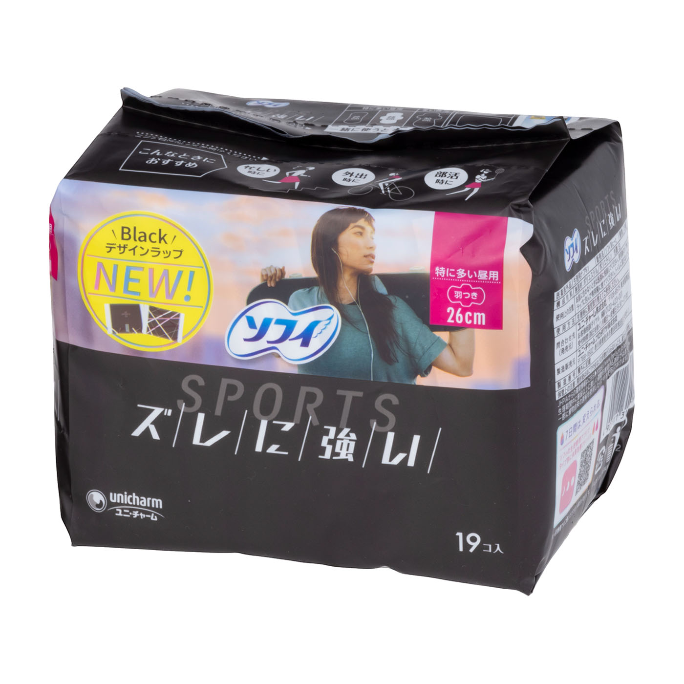 「ムーニー」などの紙おむつや、「ソフィ」などの生理用品で知られる日用品メーカー、ユニ・チャームが販売している「ソフィ SPORTS(スポーツ) 特に多い昼用 羽つき 26cm」は、アクティブな女性に向けた商品と謳っています。吸水力の高さの検証では平均49.4mLの水を吸収。多い日の経血量はおおよそ20〜30mLなので、多い日でも漏れの心配が少ないでしょう。粘着テープが20cmと長いうえテープ同士の間隔も狭いので、ショーツにしっかりと固定でき、ずれにくいといえます。つけ心地についても柔らかな肌触りが好印象。しかし、逆戻りが多くベタつきが気になりやすいことは難点です。モニターからは「とても柔らかく、長さがあるもののゴワつきは感じない」「ズレる感覚はほぼない」との声が挙がり、日中快適に使用できるといえるでしょう。アクティブに動きたい日や、多い日におすすめの商品です。しっかりした吸水力とずれにくさを求めるなら候補に入るでしょう。