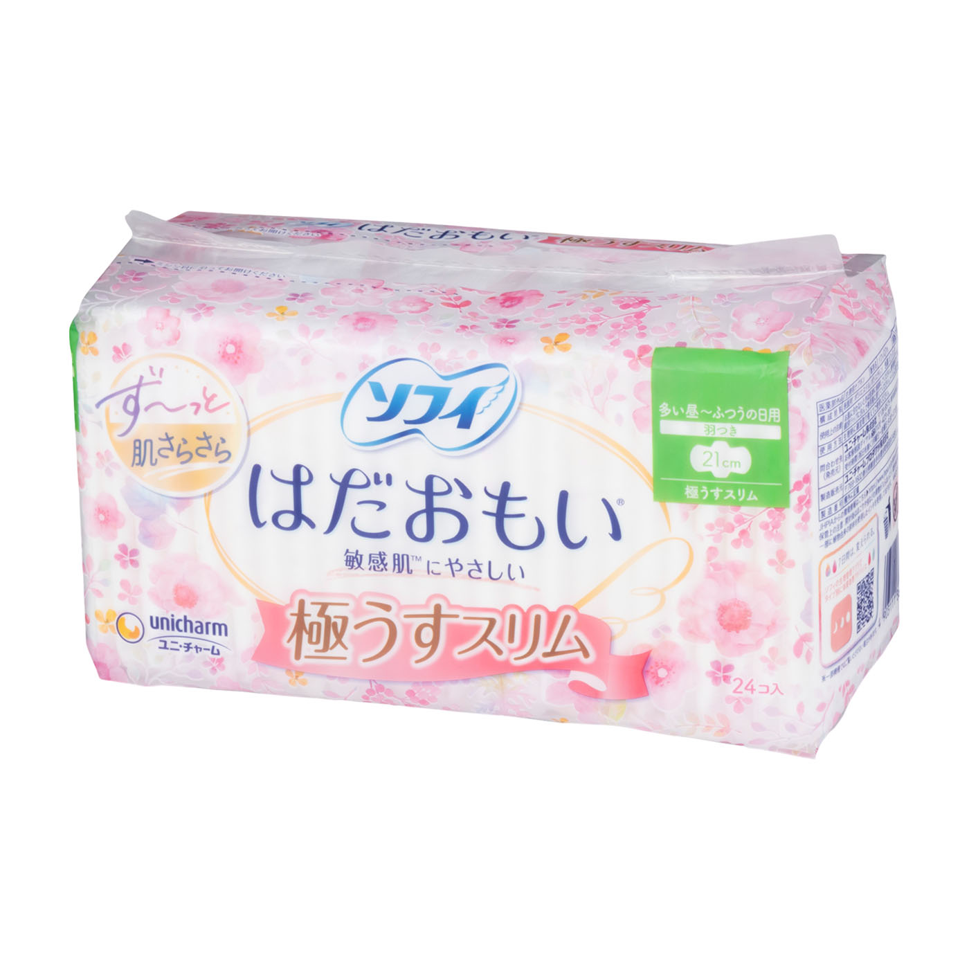 「ムーニー」などの紙おむつや、「ソフィ」などの生理用品で知られる日用品メーカー、ユニ・チャームが販売している「はだおもい 極うすスリム 多い昼~ふつうの日用 羽つき21cm」は、生理中の敏感肌にやさしいナプキンと謳われています。吸水ポリマー使用で、吸水力の高さの検証では平均35.2mLの水を吸収。多い日の経血量はおおよそ20〜30mLなので、普通の日や少ない日に使用するには十分ですが、経血量が多い日には漏れやすいでしょう。逆戻りが多く、吸水後の表面のベタつきが気になりやすいといえます。粘着テープが13cmと長めでテープ同士の間隔が狭いので、日中活発に動いてもずれにくいでしょう。つけ心地の検証では、モニターから「ふんわりした素材なのでゴワつきは特に気にならなかった」「程よい厚み感で股にフィットしていた」という声が挙がりました。経血量が少ない人で、つけ心地も重視したいなら適していますが、経血量が多い人はほかを検討しましょう。