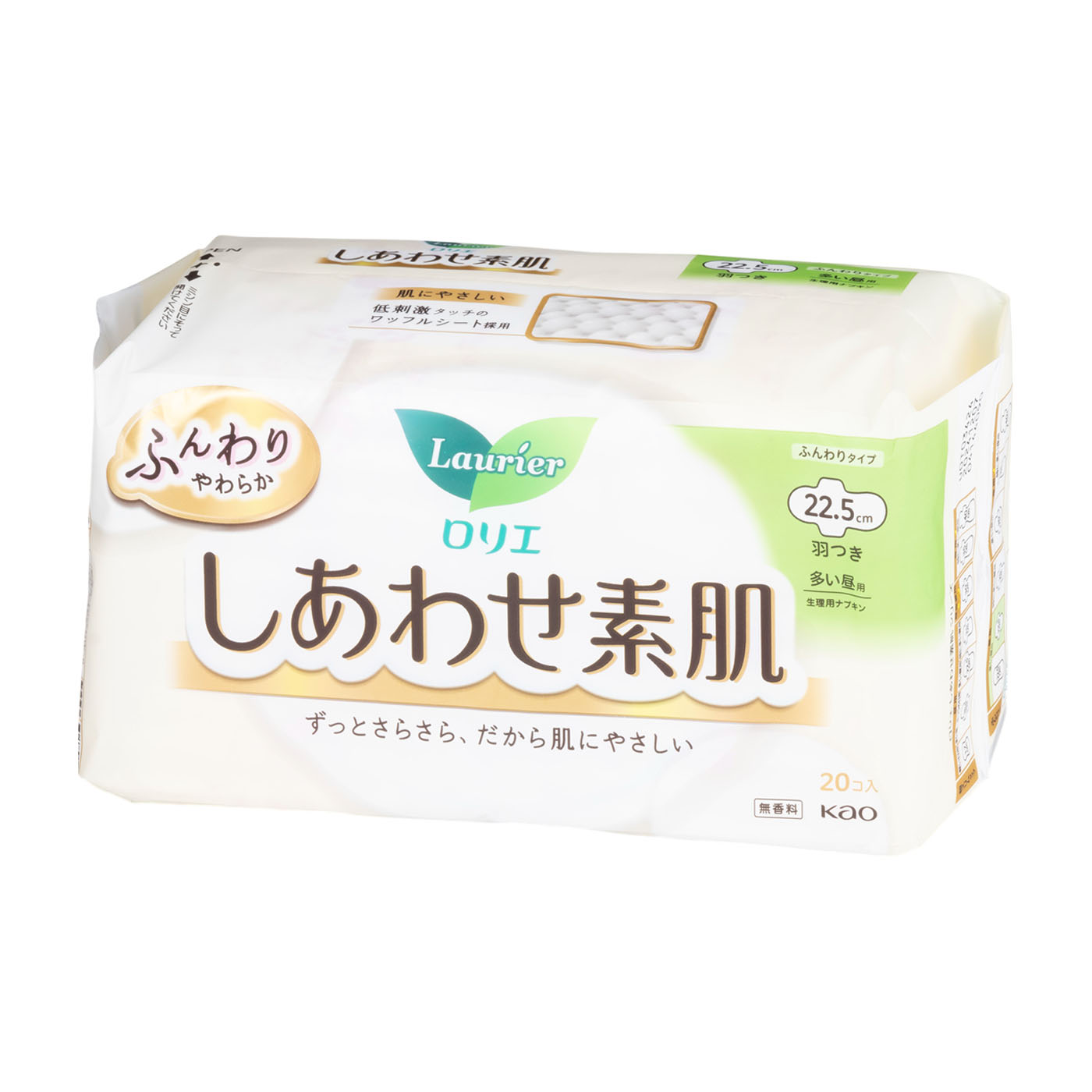「アタック」「ビオレ」などの日用品・化粧品でお馴染みの花王が販売する、「しあわせ素肌 多い昼用22.5cm 羽つき」は、表面の素材は化学繊維ですが、ワッフルシートを採用しており肌にあたる面を最小限に抑えたと謳う商品です。吸水力の高さの検証では、平均73.4mLの水を吸収。多い日の経血量はおおよそ20〜30mLなので、経血量が多い日でも漏れの心配が少ないでしょう。吸水後も表面がサラッとしていて逆戻りが少なく、着用中のベタつきが気になりにくいことも魅力。粘着テープが15cmと長いうえテープ同士の間隔も狭いので、日中活発に動いてもずれにくいといえます。つけ心地のよさの検証では、モニターから「素材自体が柔らかいのでゴワつきはほぼ感じない」というプラスの声が多く挙がった一方で、ナプキンの縁がお尻と擦れることが気になったモニターもいました。縁が浮いてこないよう、端までショーツにしっかり固定できているか確認しましょう。1枚あたり約23円とやや高いのでコストを抑えたい人には不向きですが、経血量が多い日や動くことが多い日でも漏れの心配が少なく、吸水力と快適さを重視したい人にまず検討してほしい商品です。