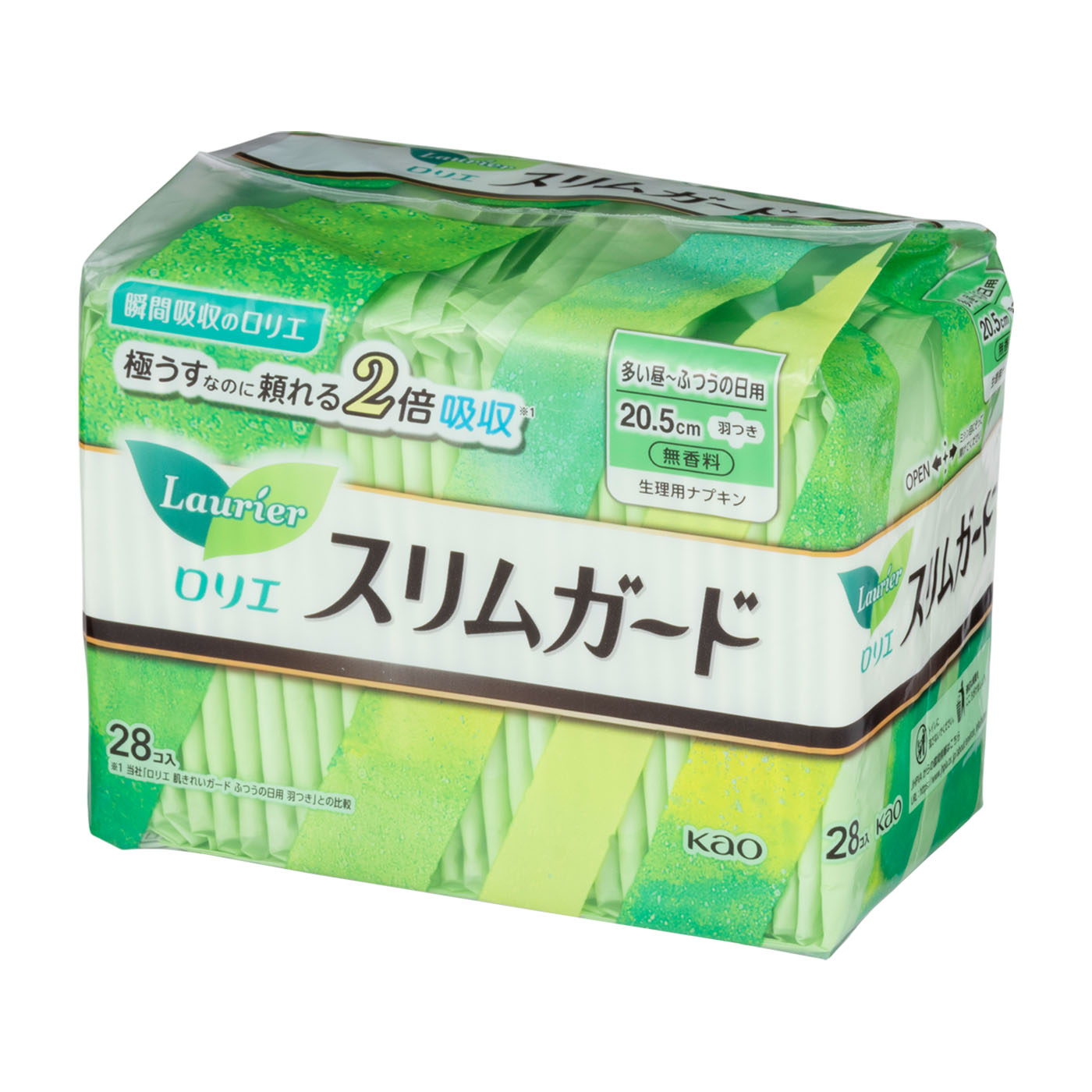 「ビオレ」「アタック」などの日用品・化粧品でお馴染みの花王が販売する、「スリムガード 多い昼~ふつうの日用羽つき 20.5cm」は、「極うすなのに頼れる吸収力」と謳われている商品です。吸水力の高さの検証では平均53.2mLの水を吸収。多い日の経血量はおおよそ20〜30mLなので、多い日でも漏れの心配が少ないでしょう。ややベタつきが気になりやすいことはネックですが、粘着テープが15cmと長いうえテープ同士の間隔が狭いので、しっかりとショーツに固定でき、日中活発に動いてもずれにくいことはメリットです。モニターからは「着用しているのを忘れるくらい薄い」というプラスの声が挙がった一方で、薄いがゆえに密着感に物足りなさを感じたモニターも。しっかりフィットするナプキンを求める人には不向きでしょう。個包装の厚みが0.5cmと薄いので、小さいポーチに入れても嵩張りにくい商品です。