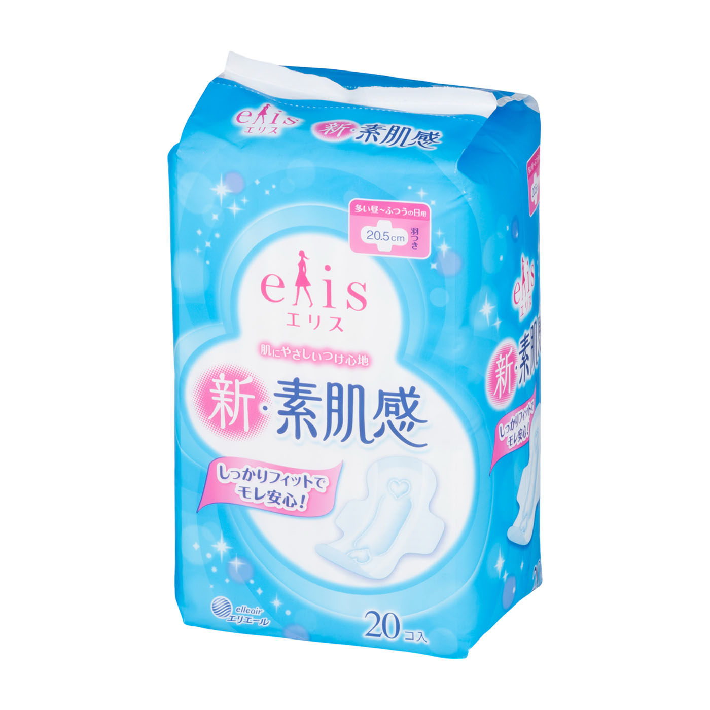「エリエール」や「エリス」などの家庭紙・生理用品でお馴染みの大王製紙が販売する「素肌の気持ち 多い昼〜ふつうの日用 羽つき 21cm」は、1枚あたりの価格が約15円と低め。つけ心地や吸水力も重視したいけど、できるだけコストを抑えたい人にぴったりの商品です。検証では、平均61.4mLの水を吸収。多い日の経血量はおおよそ20〜30mLなので、経血量が多めの人やなかなか替えられない日の使用にも適しています。また、逆戻りが少なくベタつきにくいこともメリット。つけ心地については肌触りが評価される一方で、一部のモニターから「歩く際のゴワつきが気になった」という意見が挙がりました。粘着テープが13cmと長めですがテープ同士の間隔がやや広く、日常の動作であればずれにくいものの、活発に動くとずれる可能性があります。とはいえ、吸水力が高く不快感も少ない、全体的にバランスが取れた商品です。コスパ重視の人はまず検討してくださいね。