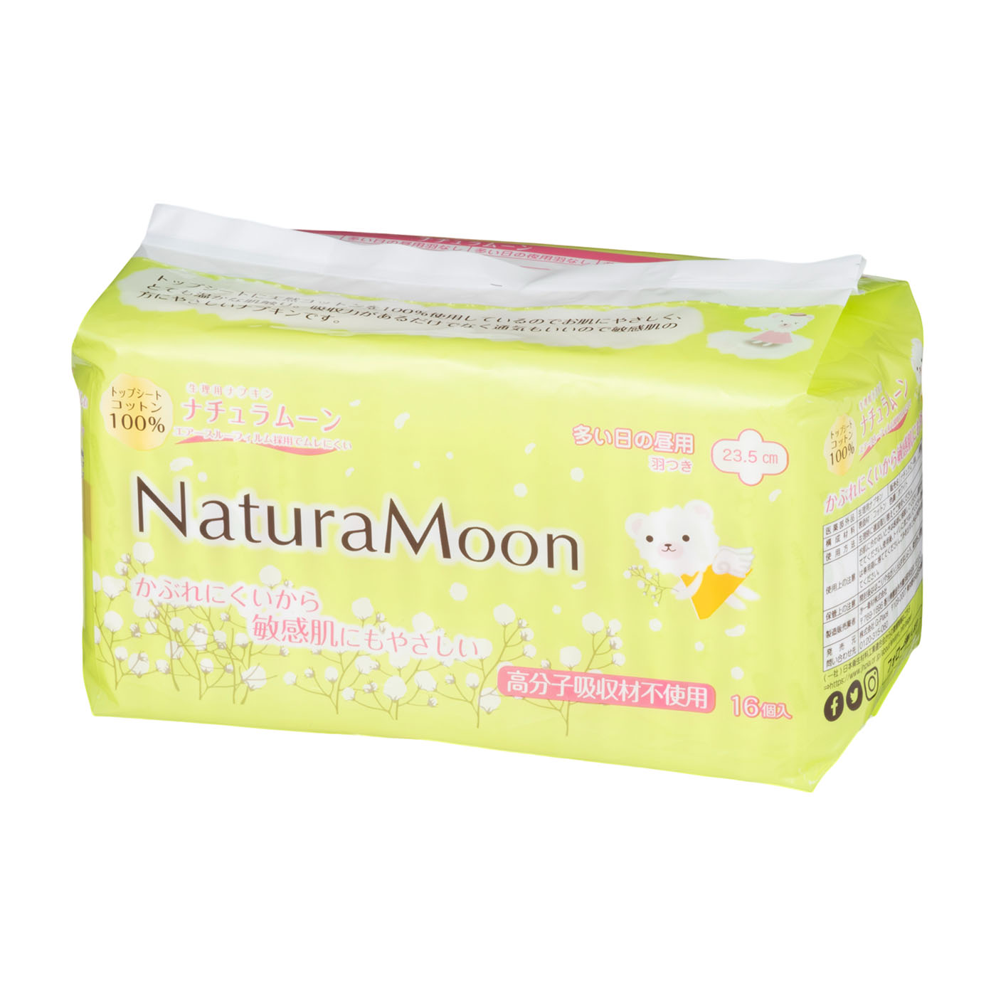 「エリエール」や「エリス」などの家庭紙・生理用品でお馴染みの大王製紙が販売する「ネイチャリス オーガニックコットンナプキン」は、表面に100%オーガニック素材を採用したナプキンです。吸水力の高さの検証では平均54.6mL吸水。多い日の経血量はおおよそ20〜30mLなので、多い日やこまめに替えられない日でも漏れの心配が少ないといえます。吸水ポリマーを使用しているので逆戻りは多くないものの、表面がコットン素材なので湿り気は気になるでしょう。また、粘着テープが13cmと長めですがテープ同士の間隔がやや広く、日常の動作であればずれにくいといえますが、活発に動くとずれる可能性があるので注意してください。一方、ナプキンの縁まで柔らかく、モニターからは「まるで着用していることを忘れるほど快適」といった声が挙がり、つけ心地は好印象。吸水力と快適さを重視する方におすすめです。1枚あたりの価格が約22円とやや高めですが、それに見合った満足感を得られるでしょう。