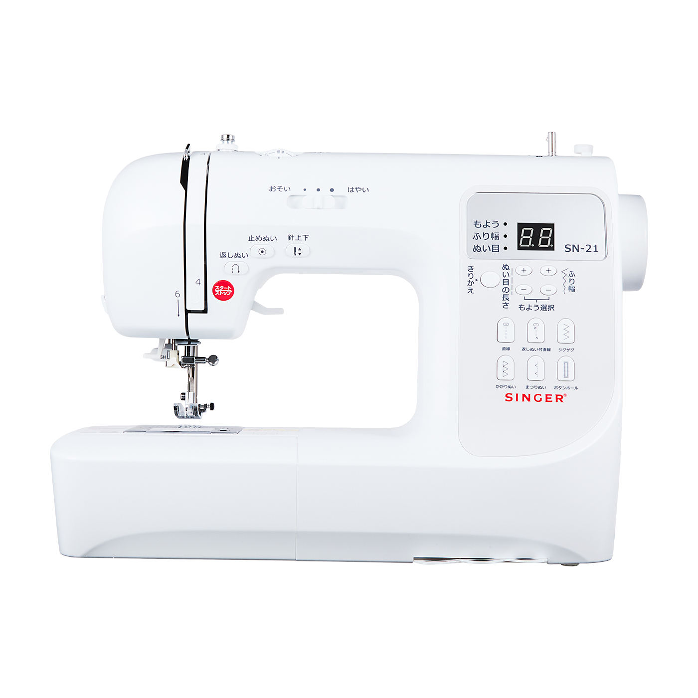 ハッピージャパンの「シンガー 買って後悔しないミシンver2 SN-21」は、コスパ重視のミシン初心者におすすめ。自動糸調子機能はないものの、糸のセット方法は冊子や動画で確認でき、縫い模様を簡単に選択できるボタンもついています。フットペダルやワイドテーブルもあり、2024年9月時点で3万円以下ながら使いやすい機能が充実していました。実際に生地を縫ったところ、薄地・普通地・伸縮地・厚地のすべてで仕上がりの良さが高評価に。検証したなかには厚地が苦手な商品もあったなか、波打ちやたるみのないきれいな縫い目ができました。薄地でジグザグ縫いをしたところ、生地の端を丸め込んでしまったものの、直線縫いならきれいな仕上がり。作業台は小さめですが、取り回しに気になるところもありません。さらに検証したなかでは珍しく英数字縫いが可能で、縫い模様も豊富。ファスナー押さえとボタンホール押さえが付属するので、通園・通学グッズの装飾もしやすいでしょう。稼動音は約61.9dBとうるさくはありません。換気扇の音の大きさほどで、気になりにくいでしょう。本体重量は5.9kgとそれほど軽くはないものの、持ち手・ハードケース・コードリールつき。縫い目の仕上がりや片づけやすさのバランスが取れた、コスパのよいコンピューターミシンです。使いこなせるか不安で予算を抑えたいと考えているミシン初心者は、ぜひ検討してみてください。