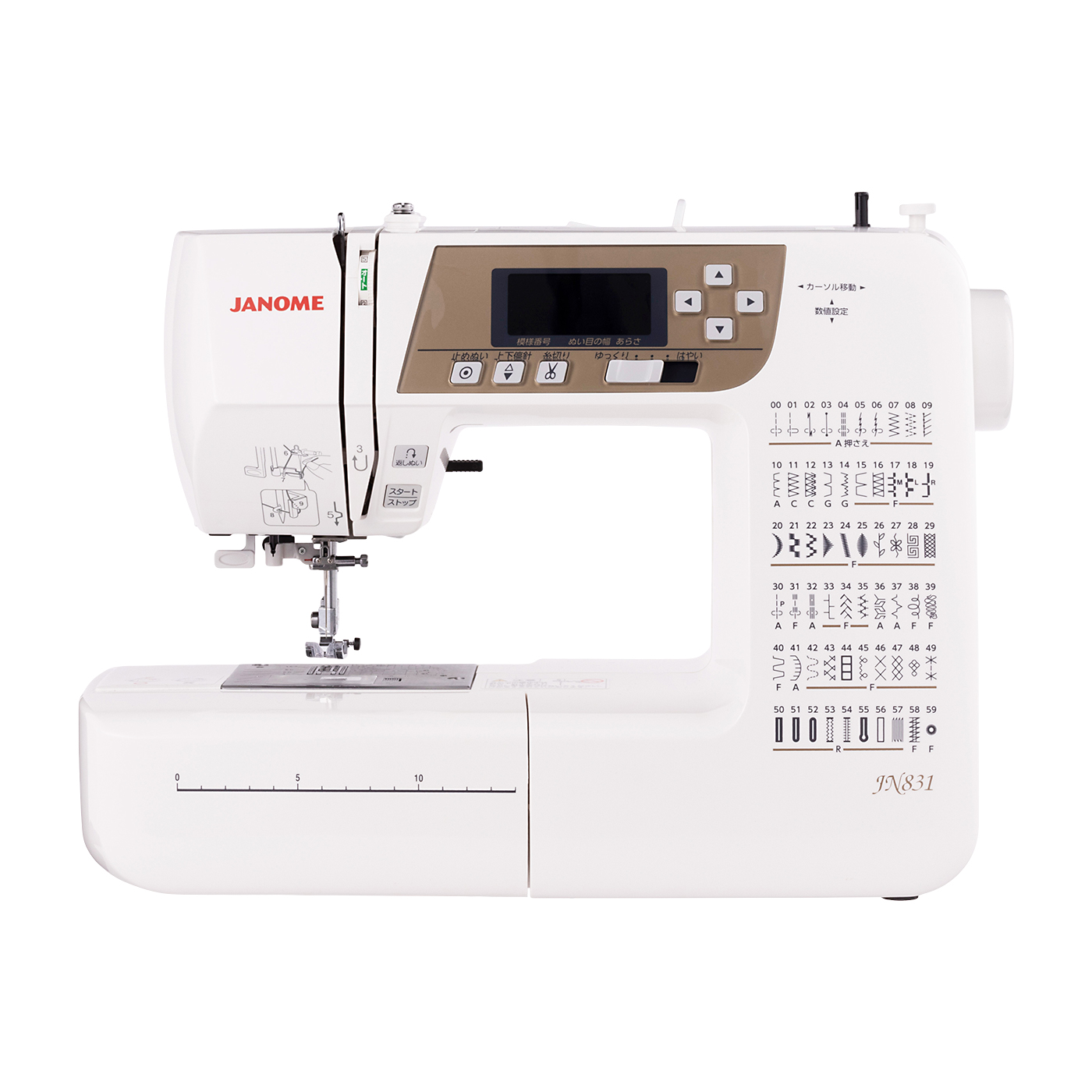 ジャノメの「プログラム自動糸切り機能付コンピュータミシン JN831」は、すべてのミシン初心者におすすめです。検証したなかで唯一自動糸調子機能があり、難しい糸の張り具合の調節は基本的に不要。糸のセット方法を解説したDVDが付属しているうえ、自動糸切ボタンやフットペダル・ワイドテーブルなども搭載していて、ミシンの経験が少ない人も使いやすいでしょう。仕上がりの良さは薄地・普通地・伸縮地・厚地すべてで高評価に。洋裁の専門家が実際に生地を縫ったところ、薄地・普通地は縫い目がきれいで粗さや波打ちが見られませんでした。苦戦した商品もあった厚地でも文句のない仕上がりで、布の種類を問わずきれいに縫えるでしょう。作業台は小さめですが、押さえと下の送り歯のフィット感が良いため布送りがしやすく、安定して縫い進められました。持ち手・ハードケースがついており、持ち運びや収納にも便利。重量は6.0kgとやや重いものの、頻繁に動かすのではなければ気にならないでしょう。実際の稼動音は約64.8dBと、トイレの洗浄音や子どもの足音ほどの大きさです。検証したなかでは平均的で、日中の作業ならそれほど気にならないでしょう。縫い模様は59種類あり、ファスナー押さえやボタンホール押さえが付属します。ただし、文字縫い機能はないため、通園グッズ作りには物足りなく感じるかもしれません。とはいえ、糸調子を調整しなくても布の種類を問わずきれいに縫えるので、ミシン初心者はぜひ最初に検討してみてください。
