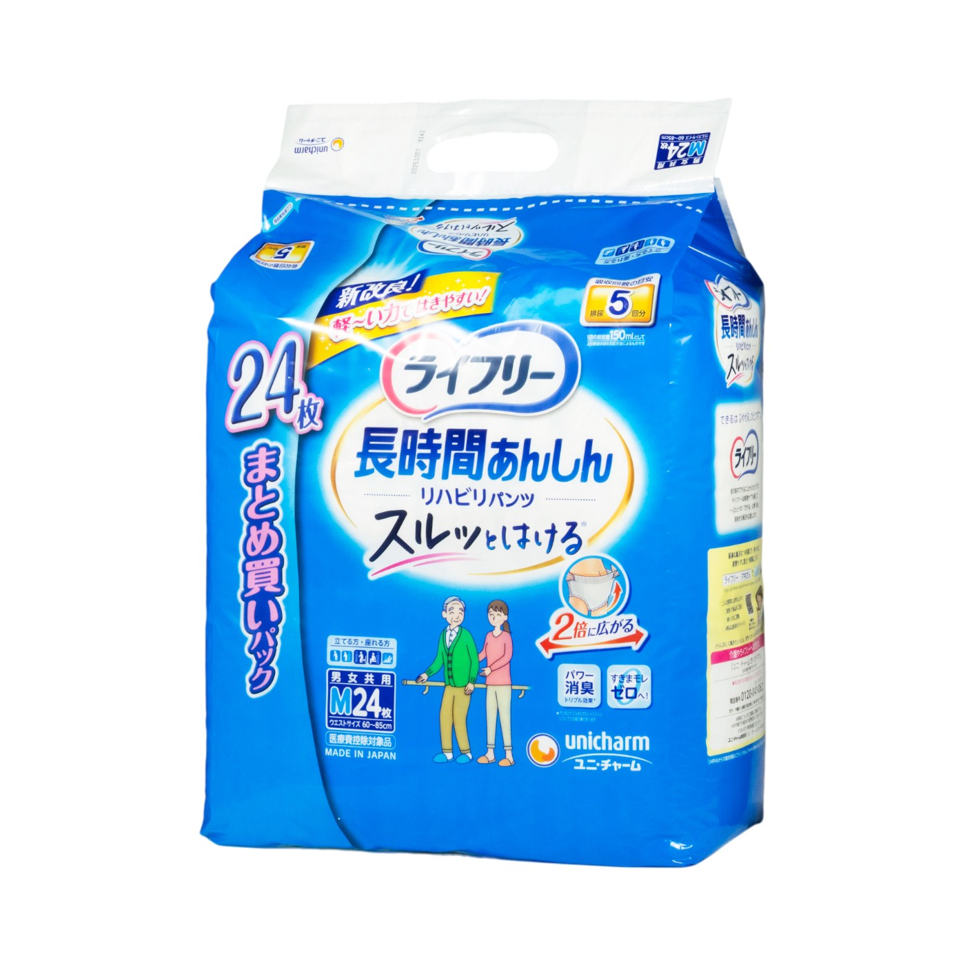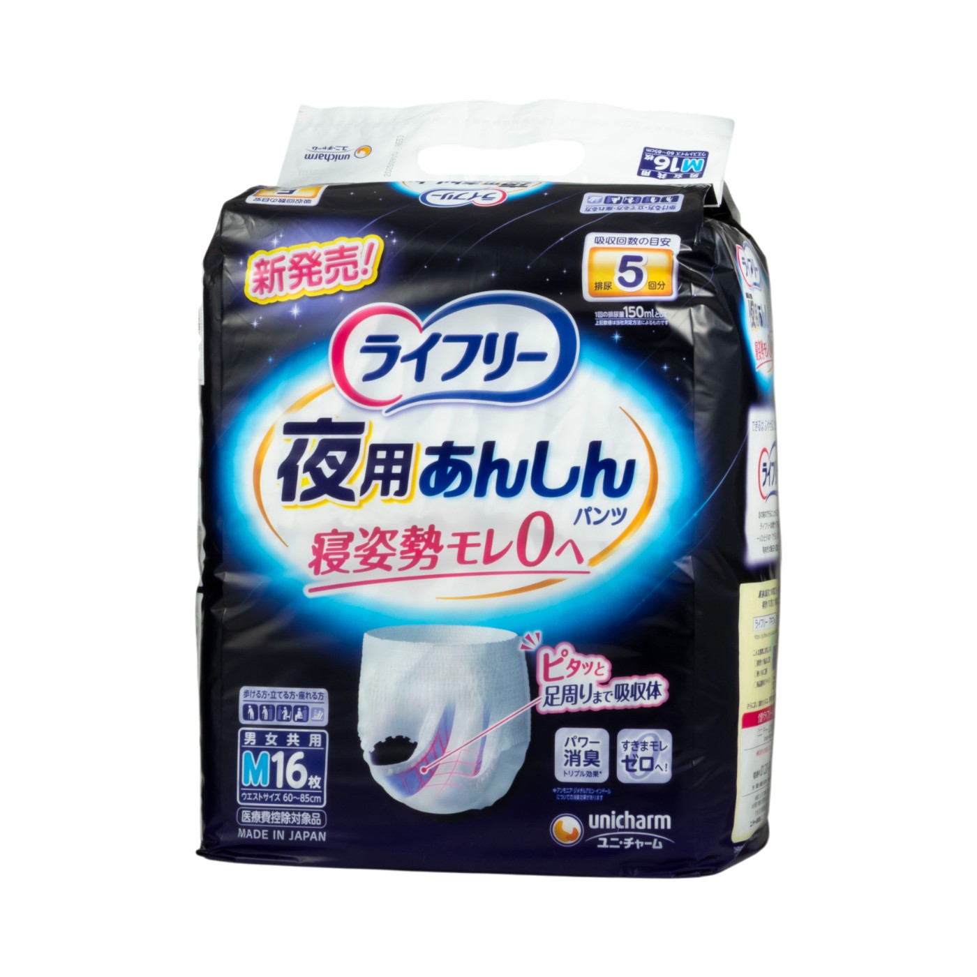 ユニ・チャームの「ライフリー 夜用あんしんパンツ 5回吸収」は、朝まで快適に眠りたいと願う人のために開発された、夜用の大人用紙パンツ。就寝中の尿に配慮した幅広の吸収体が、おしり全体をすっぽり包み込み、本人と家族の穏やかな夜をサポートするつくりです。検証では、就寝中の漏れを防ぐための細やかな設計が確認できました。足まわりの2重のゴムがすき間を作らず、一晩のうちに何度も繰り返される寝返りや姿勢の変化に対応していました。就寝中の横漏れをしっかりガードできるでしょう。シーツを汚す心配を減らし、安心して朝を迎えたい人におすすめです。さらに、ベタつきにくさの検証では、吸収した擬似尿がほとんど逆戻りしない結果に。長時間続く快適な肌ざわりで、サラサラの状態を保てるでしょう。尿の逆戻りによる肌への負担が少ないうえ、ベタつきによる不快感で目を覚ますことも減らしたい人に適しています。就寝前の交換がスムーズに行えるように、装着のしやすさも考えられた設計です。腰まわりと足まわりの部分がとても柔らかく伸びたので、力を入れずにスッと履かせられるでしょう。介助する人の負担を軽減し、穏やかな気持ちで就寝準備を整えられる、使う人すべてにやさしい商品です。
