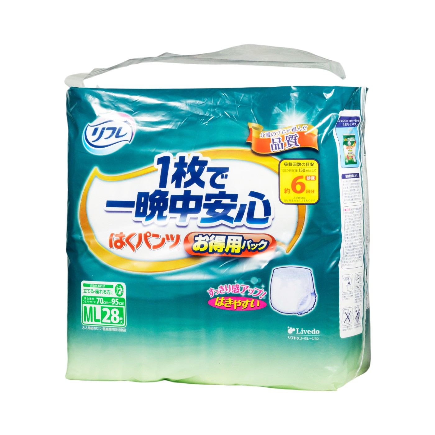 リブドゥコーポレーションの「リフレ はくパンツ 1枚で一晩中安心」は、朝まで安心して眠ることを追求した夜用の大人用紙パンツです。股下部分がすっきりしたカットにすることで、就寝中のゴワつき感を軽減。歩ける人から寝たきりの人まで快適な夜をサポートするつくりです。検証したところ、漏れを防ぐための頼もしい設計が光りました。 横モレ防止ギャザーと2重のゴムが、足まわりを隙間なく包み込みます。寝返りなどで体勢が変わっても、漏れをしっかり防止できるでしょう。ベタつきにくさも高評価。検証では、吸収した擬似尿がほとんど逆戻りしなかったため、肌に触れる表面はいつもサラサラの状態を保てるでしょう。夜間で長時間着用してもベタつきによる不快感が少なく、肌トラブルを避けたい人にも適しています。就寝前の交換もスムーズに行える構造です。ウエストと腰まわりに伸縮性があるため、引っかかり少なく履かせることができ、介助する人の負担を軽減できるでしょう。気になるにおい漏れも抑えられており、使う人すべてに配慮された商品です。