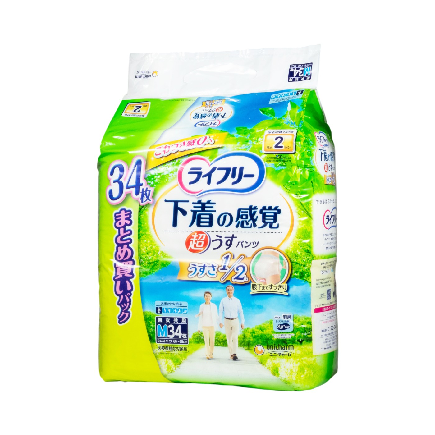 ユニ・チャームの「ライフリー 超うす型下着感覚パンツ 2回」は、下着のような自然な履き心地を謳う大人用紙パンツ。ごわつきが少ない超うす吸収体が体にやさしくフィットし、全面通気シートが蒸れをしっかり防ぐつくりです。最大の特徴は、漏れに対する安心感の高さです。ギャザーをチェックしたところ、内側の漏れ防止ギャザーがしっかり立ち上がり、足まわりの2重ゴムがすき間を作らずにやさしくフィット。立ったり座ったりといった体の動きにも柔軟に対応するため、活動的なシーンでも安心感があるでしょう。着用中の快適さも魅力です。検証では、一度吸収した擬似尿がほとんど肌へ逆戻りしなかったので、長時間の使用でも肌が湿りにくく、サラサラ感が続くでしょう。肌への負担を減らしたい人や、心地よい着用感を大切にしたい人にもおすすめです。軽い力で履ける装着のしやすさも、見逃せないポイント。腰まわりと足まわりのゴムがとてもスムーズに伸びるため、力を入れずにスッと履きやすいつくりです。手先の力が弱い人はもちろん、介助する人の負担も軽減してくれる、毎日にうれしい使いやすさを実現した商品といえます。