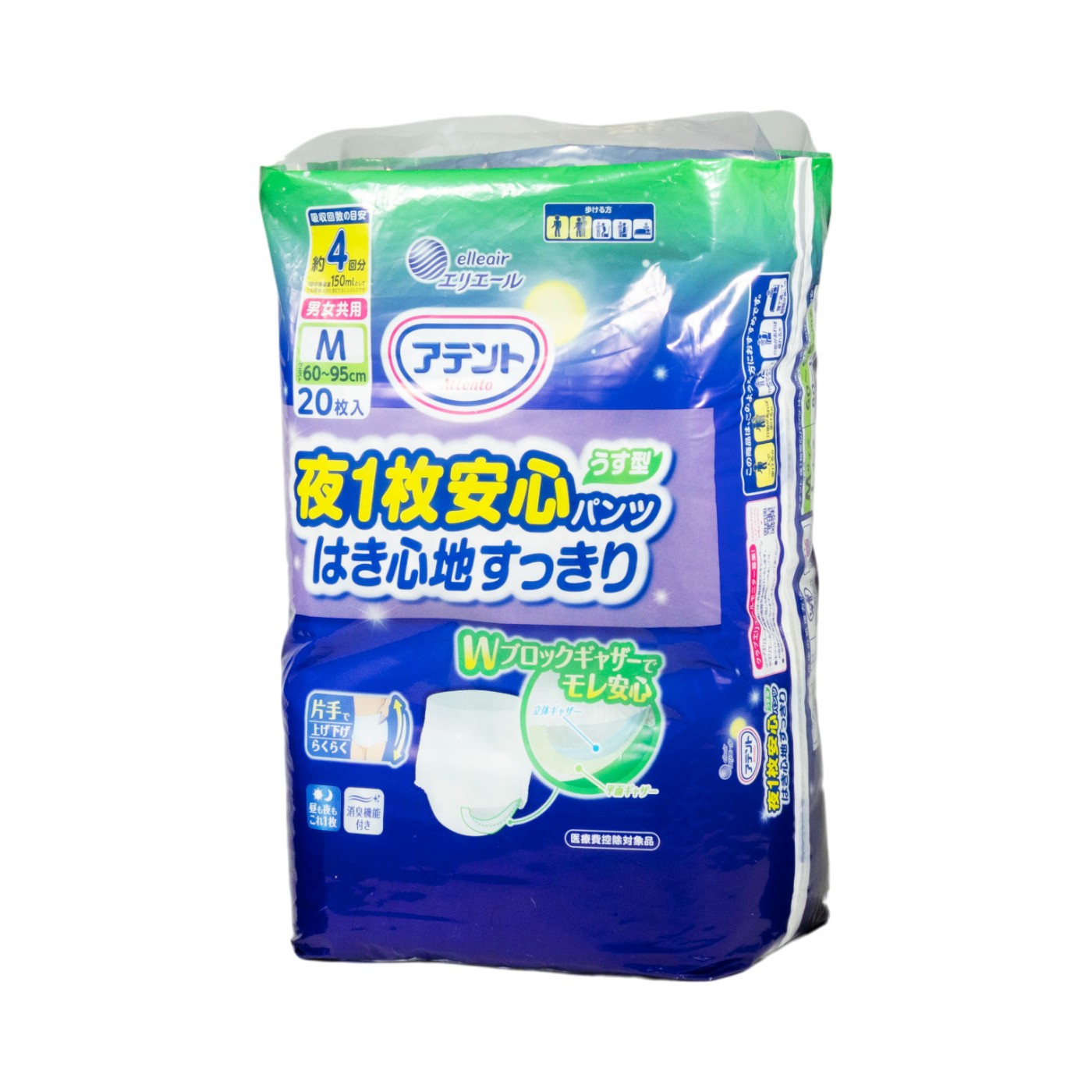 大王製紙の「アテント 夜1枚安心パンツ はき心地すっきり」は、夜の安心感と日中のような軽やかな履き心地の両立を謳う、うす型の大人用紙パンツです。独自のWギャザー構造が漏れをしっかり防ぎつつ、全面通気性シートがムレを防止。ゴワつきが気になる人でも、快適な夜を過ごせるよう配慮しています。商品をチェックしたところ、足まわりに二重に配置されたギャザーが体の動きに合わせて柔軟にフィットするつくりで、漏れにくさに配慮されていました。寝返りのような姿勢の変化があってもすき間ができにくいため、横漏れのリスクを軽減できるでしょう。長時間履き続けるからこその、ベタつきにくさも大きな魅力です。検証では吸収した擬似尿の逆戻りが少なかったので、肌に触れる表面はいつもサラサラの状態を保てるでしょう。肌が湿りにくく、快適な状態を長く保ちやすいといえます。装着のしやすさも、実際に試してわかったうれしいポイントです。腰まわりと足まわりの部分がとてもスムーズに伸び、力を入れずにスッと履きやすい設計です。介護者の負担を減らせるだけでなく、自分で履く場合も無理な姿勢になりにくく、転倒のリスクを減らせるでしょう。