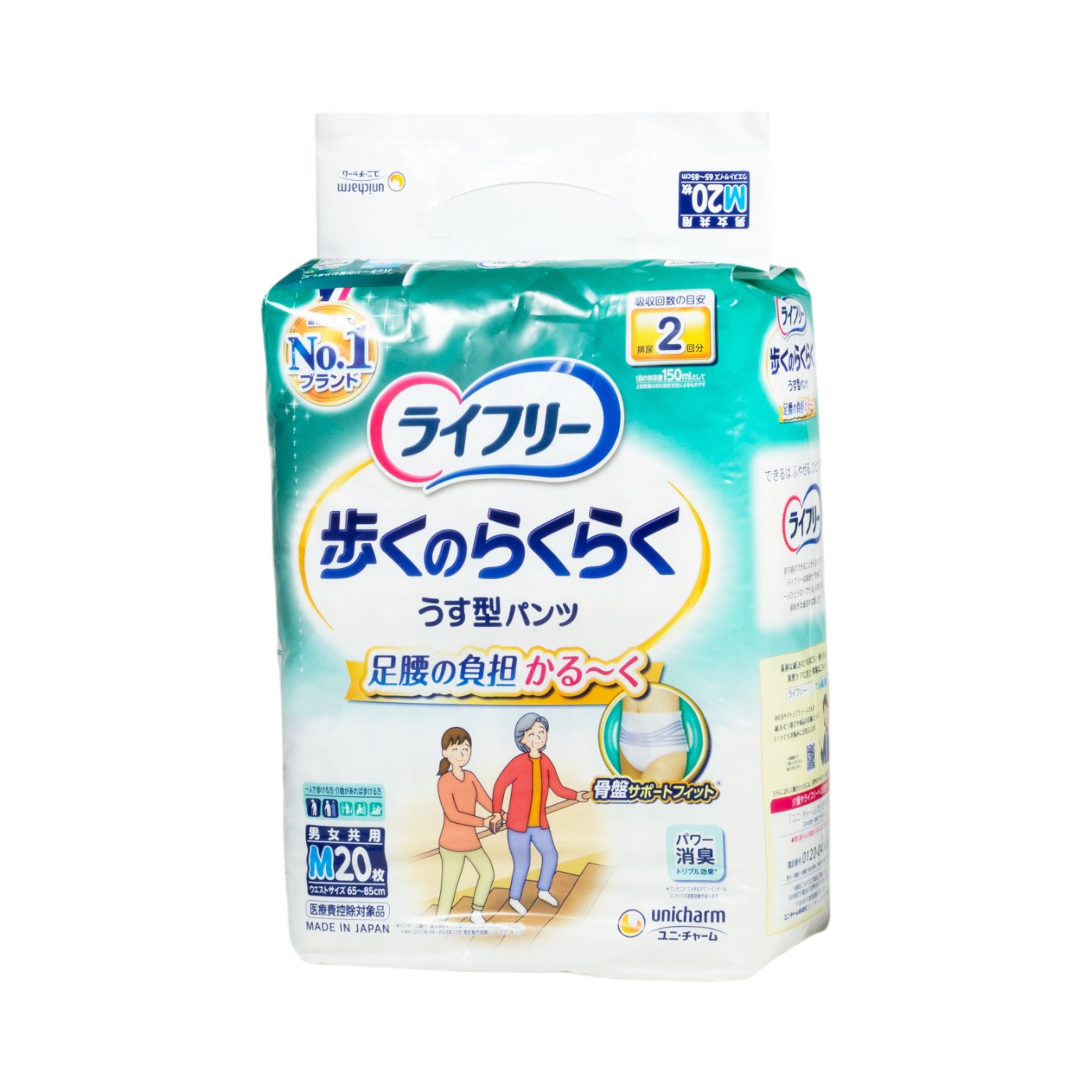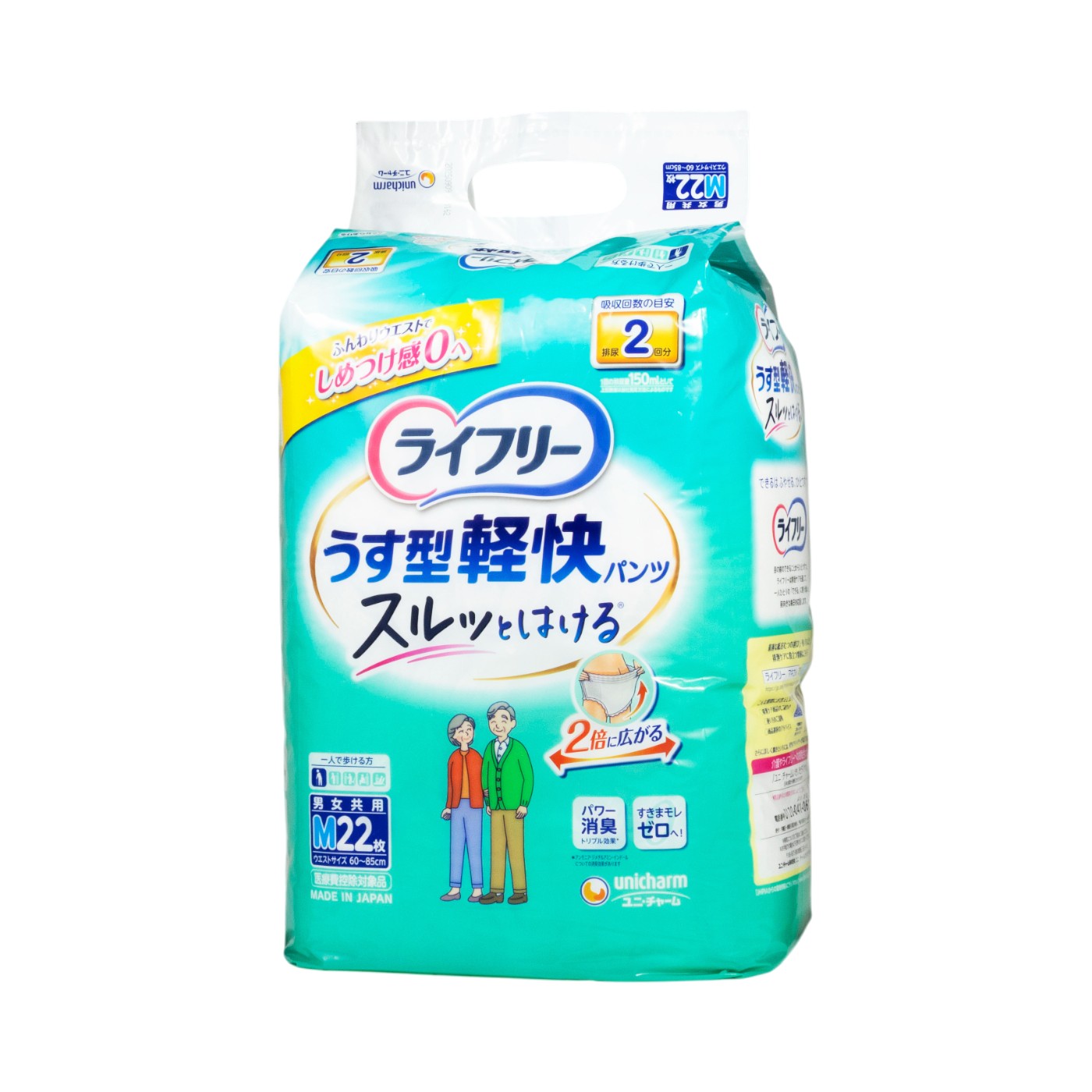 ユニ・チャームの「ライフリー うす型軽快パンツ」は、軽やかな履き心地を追求した大人用紙パンツです。独自の「ふんわりウエスト」が締め付け感をやわらげ、「股下すっきり設計」がゴワつきを抑えるつくり。サイズ展開は、Sから3Lまでと豊富です。検証した結果、ギャザーがしっかり立ち上がる構造で、尿漏れをガードできることがわかりました。足まわりの2重ゴムが体にやさしくフィットし、動いたときのズレを防止。活動的な日常を送る人に、大きな安心感を与えてくれるでしょう。さらに、擬似尿を吸収後の表面をチェックしたところ、逆戻りが少なく、サラッとした状態を保てることを確認しました。ベタつきによる不快感が少なく、デリケートな肌への負担を軽くしたい人に適しています。装着もスムーズな設計です。ウエスト部分がやわらかく伸縮するので、軽い力で引き上げられます。介助する人はもちろん、自分で履き替える人の負担も軽減されるでしょう。