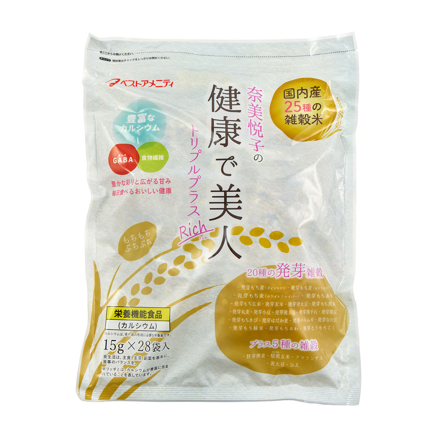 ベストアメニティの「奈美悦子の25種雑穀トリプルプラスRich」は、25種類の雑穀と貝カルシウムがブレンドされた商品。カルシウムの補給が可能な栄養機能食品です。食感は、モチモチ感が少ないうえ、雑穀の硬さがあり好みが分かれる結果に。モニターからは「雑穀の大きさ・硬さに違和感があり食べにくい」という声が挙がった一方で、「雑穀の食感がアクセントになっており食べ応えがある」という声も挙がりました。カリカリとした雑穀の食感を楽しみたい人にはおすすめです。栄養面では、1食あたりの食物繊維量が2.40gなので、1食の理想摂取基準である2.11gを大きく上回る結果となりました。筋トレサポートに期待できる穀物はアマランサスのみですが、ハトムギ・あわ・黒米・赤米は含まれていたので美容サポートは期待できるでしょう。炊き方は、白米1合に対し、本品1袋を混ぜるだけです。個包装で計量不要なので、手軽さは申し分なく、空気に触れないため鮮度も保てます。