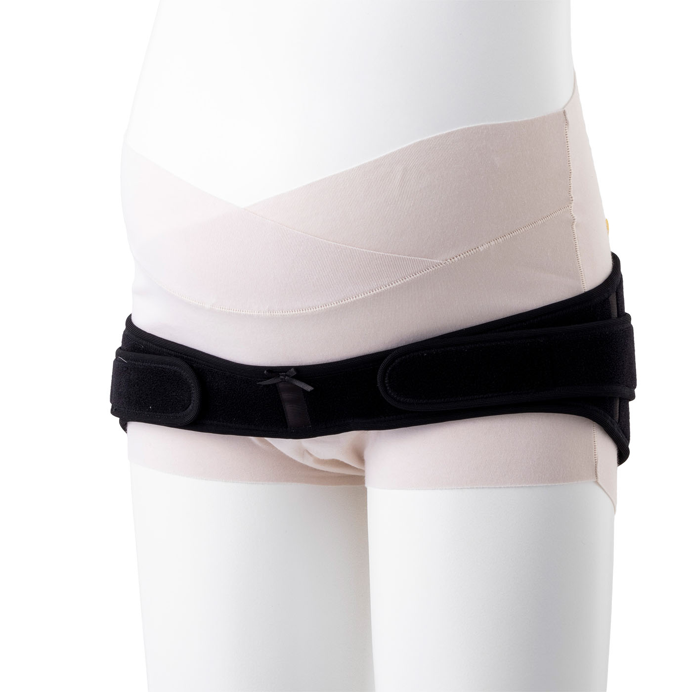 犬印本舗の「なが〜く使えるマタニティベルト HB8149」は、恥骨部分にリボンがついているので装着の際に目印にすることができます。また、ベルト後部のクロス加工とカーブがついた形状で体にフィットしやすいと謳っている商品です。ベルト後部が上下に分かれていないので掴まれるというよりは、骨盤を圧迫される感覚を強く感じました。しかし、一部に伸縮性があるのでフィットさせやすいうえ、動いてもずれにくいのはうれしいポイントです。前側ベルトが細めで、日常生活を送るなかで食い込みが気になることはほとんどありませんでした。また、説明動画ありで手順を確認しながら装着できるので間違える心配は少ないといえます。しかし、ベルトをお尻の後ろで交差させないといけないことや、ベルトが前留めでお腹が大きくなってきたときに装着がしにくくなる可能性が高いことから装着に慣れが必要になるでしょう。腰部分も恥骨部分も厚みがあるので通気性が悪いのは惜しいところ。汗をかいたら適宜外して汗を拭き取るようにしてくださいね。