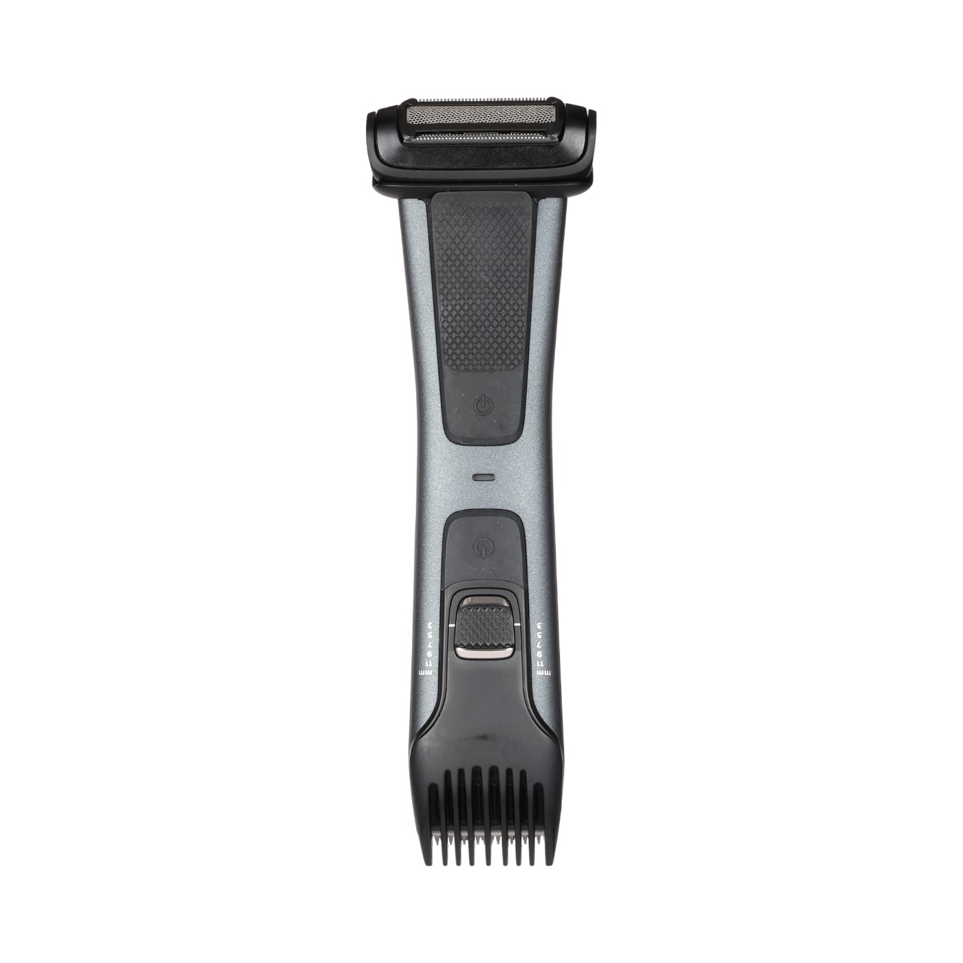 Braun「ボディグルーマー」は、肌を保護するためのスキンシールドテクノロジー搭載でデリケートゾーンにも使用できる、体毛に特化した設計であると謳っているメンズボディシェーバーです。スライド式のアタッチメントは3mm~11mmを5段階で調節できるほか、デリケ-トゾーン用や1mmに短く整えられるアタッチメントもついています。どこをどれくらいの長さに剃ればよいかわからない、ボディシェーバーを初めて購入する人におすすめです。さらに、充電式のなかでもパワフルなリチウムイオン電池を使用しているためか、ほかの商品に比べて1回で剃れる量が多く、ムダ毛の整えやすさの検証ではそこそこの評価に。テスターによるマネキンの髪の毛を剃る検証でも2回で長さを整えられたので、とにかく少ない回数で楽に剃り切りたい人にもってこいの商品です。一方、掃除用のブラシや専用のオイルがついていないのは惜しいポイント。少し平べったく短めの持ち手は手にフィットしにくく、握りやすさはまずまずの結果となりました。また、アタッチメントの先に丸みがなく鋭利なので、モニターからは「そこまで痛みはないものの、使用後の肌に白い線ができて気になる」というコメントが挙がったので、強く当てすぎないように注意してください。長さ調節のバリエーションが豊富で、少ない回数でしっかり整えられるメンズボディシェーバーです。