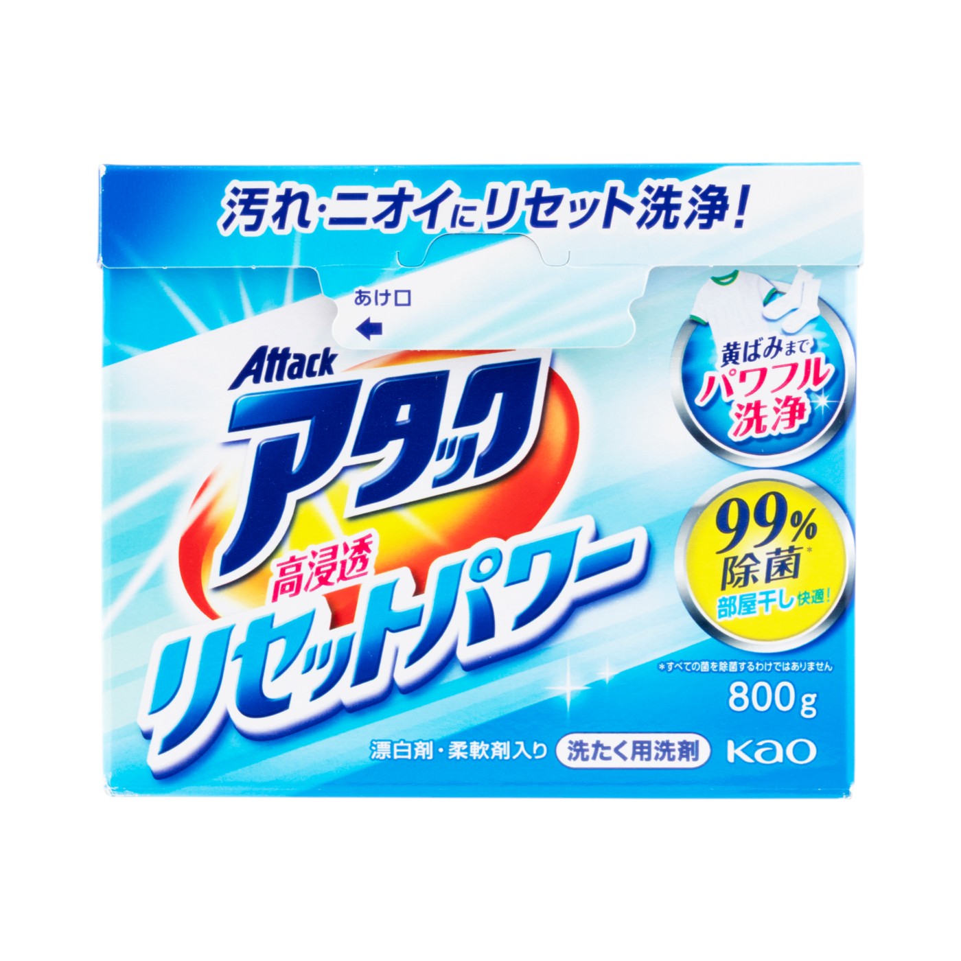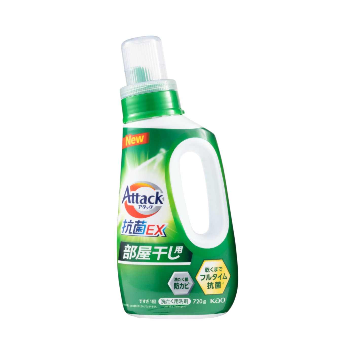 「アタック抗菌EX 部屋干し用」は、花王の定番洗濯洗剤ブランド「アタック」のひとつで、部屋干し特化タイプとして、高湿度でも強力な消臭機能を持つと謳っています。高湿度条件でも強力な消臭効果を発揮すると謳い、新たに黄ばみ除去成分や抗ウイルス機能、防カビ機能を持つ多機能洗剤です。