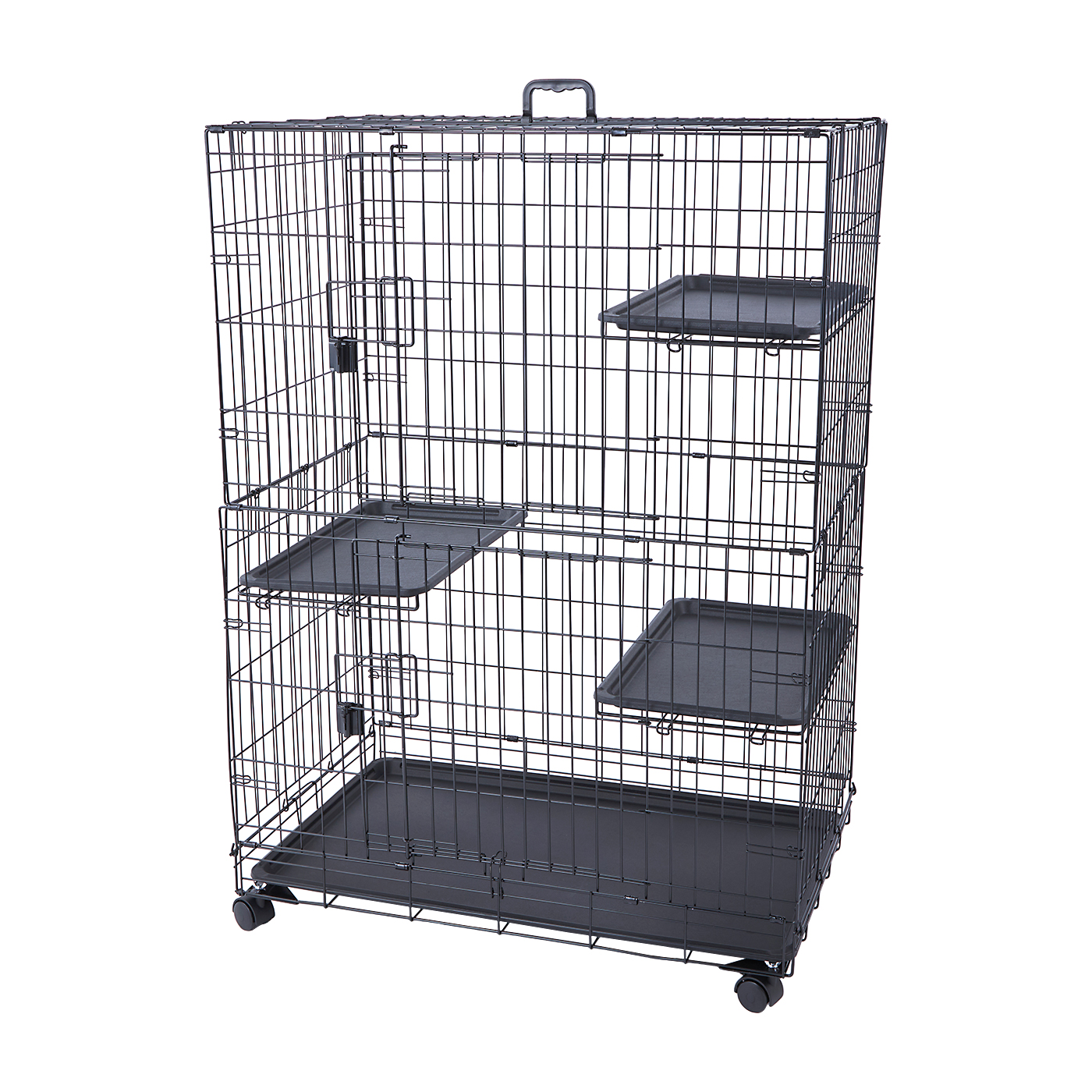 泰の「RAKU 大型キャットケージ」は、サイズ展開が豊富な猫用ケージを探している人に向いています。M~Lサイズのみならず、高さも1~3段から選べるため、小型の猫から多頭飼いの人まで種類を問わずおすすめです。基本的に大きめで、扉が大きく開く点も特徴。しかしハンモックや隠れられるスペースはなく、猫が落ちつけるような工夫が別途必要です。棚板の耐荷重は8kgと頑丈なつくりであるうえ、本体の縦のジョイントパーツは上下左右をしっかり固定するため、安定感は高いでしょう。重くても動かしやすいキャスター付きですが、ストッパーもついており、必要なときにしっかり固定できます。猫が飛び乗っても揺れるリスクは低い印象です。底面のトレーは単体で取り外せて、掃除もしやすい設計。棚板や底面がプラスチック製なので拭き取りも簡単にできます。しかし、開け閉めできるのは扉のみでケージ下部分は全開にできません。上段・下段ともにハンドルスライド式で、簡易的ではありますがロックができます。しかし、網目の間隔が2.7cmと大きめなので、子猫の頭が通らないように注意が必要です。組み立てやすさは悪くなく、動画での説明があるので視覚的に理解しやすいでしょう。工具は基本的に不要ですが、接続パーツが50個と多いため、組み立てに時間がかかる点には注意が必要です。猫の快適さはあまり期待できないものの、安定感と頑丈さが際立つ猫用ケージ。猫が快適に過ごせるようにアイテムを追加するのがおすすめですが、猫の頭数や置き場所に合ったサイズにこだわって選びたい人は検討してみてください。