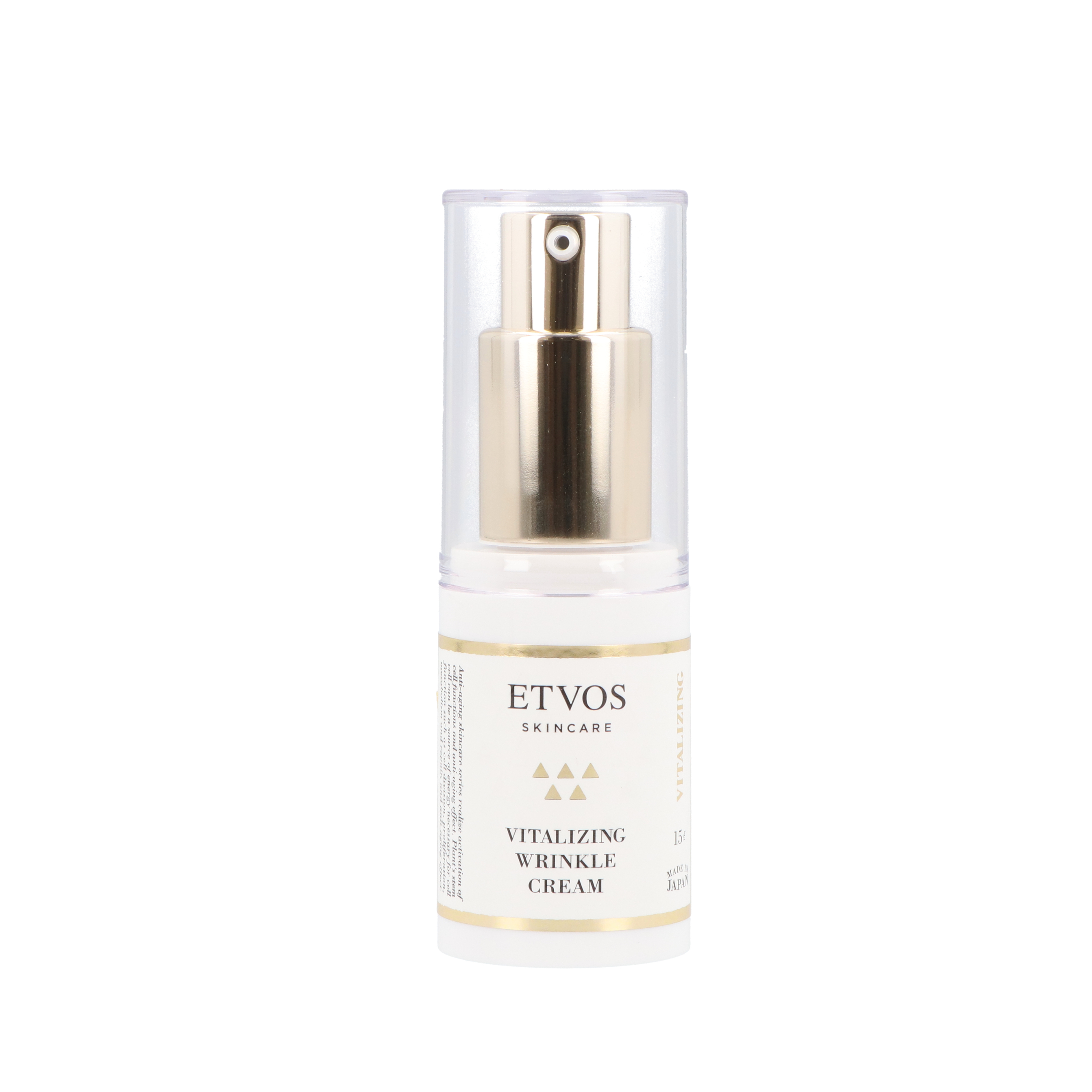 エトヴォス「バイタライジングリンクルクリーム」は、敏感肌向けを謳う目元・口元用のクリームです。「油脂」「植物性バター」を主体に、ほうれい線ケアに好適な「水添レチノール」「アルテロモナス発酵エキス」などを配合。さらに、敏感肌を意識した「ヒト型セラミド」も含みます。エイジングケアが叶うだけでなく敏感肌でも使いやすい、謳い文句どおりの成分構成が高得点の決め手です。また、塗布して4時間後も肌水分量が+72.0%とうるおった状態で、もっちりなめらかな肌に整いました。ワンプッシュで適量が出せるので、うっかり中身を出しすぎることもないでしょう。気になる香りはなく、においに敏感な人でも使いやすい印象です。やや重めのかたいテクスチャをしているので、丁寧にハンドプレスするなどしてなじませましょう。