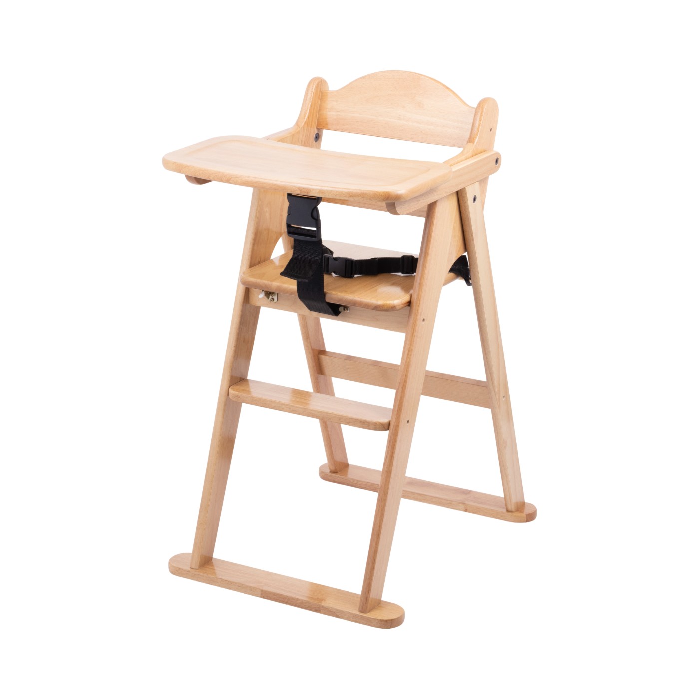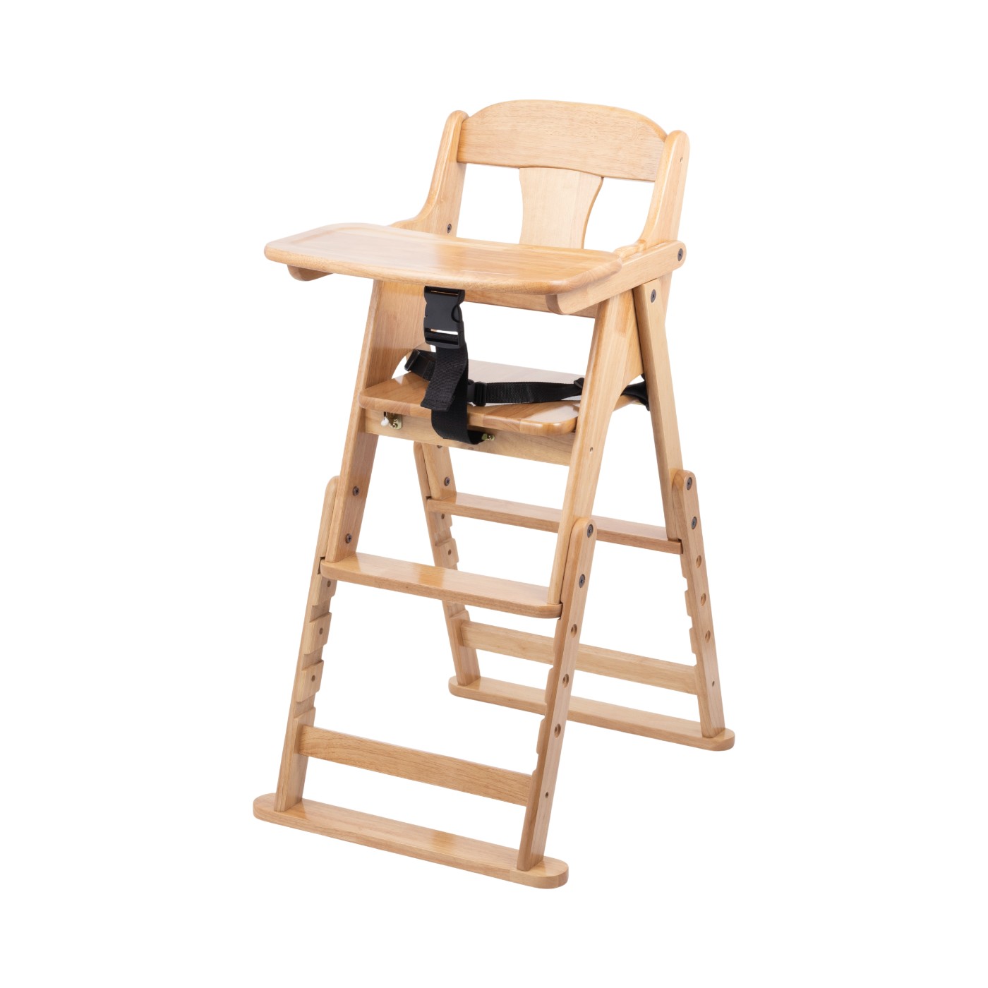 西松屋の木製ハイチェア(バニヤン)は、天然木ならではの温かみが特徴。生後7か月から約5歳まで使用可能で、耐荷重は約18kgです。折りたたんで収納できるので、孫が来たときだけ使いたい人にも向いています。座面と脚がガタつきにくく、安定感の高さは申し分なし。後方に強く押しても倒れにくく、子どもが元気よく動いても転倒する心配は少ないといえます。背もたれの高さは約29.5cmで、子どもがのけぞるのを防ぎやすい高さです。テーブル付きなので食べこぼしをキャッチでき、床が汚れるのを最小限に抑えられるでしょう。座面のベルトは腰のみを支える2点式でしたが、股ガード付きで子どもが転落しないように配慮されています。ナチュラルな印象の木製チェアを探している人はぜひチェックしてください。