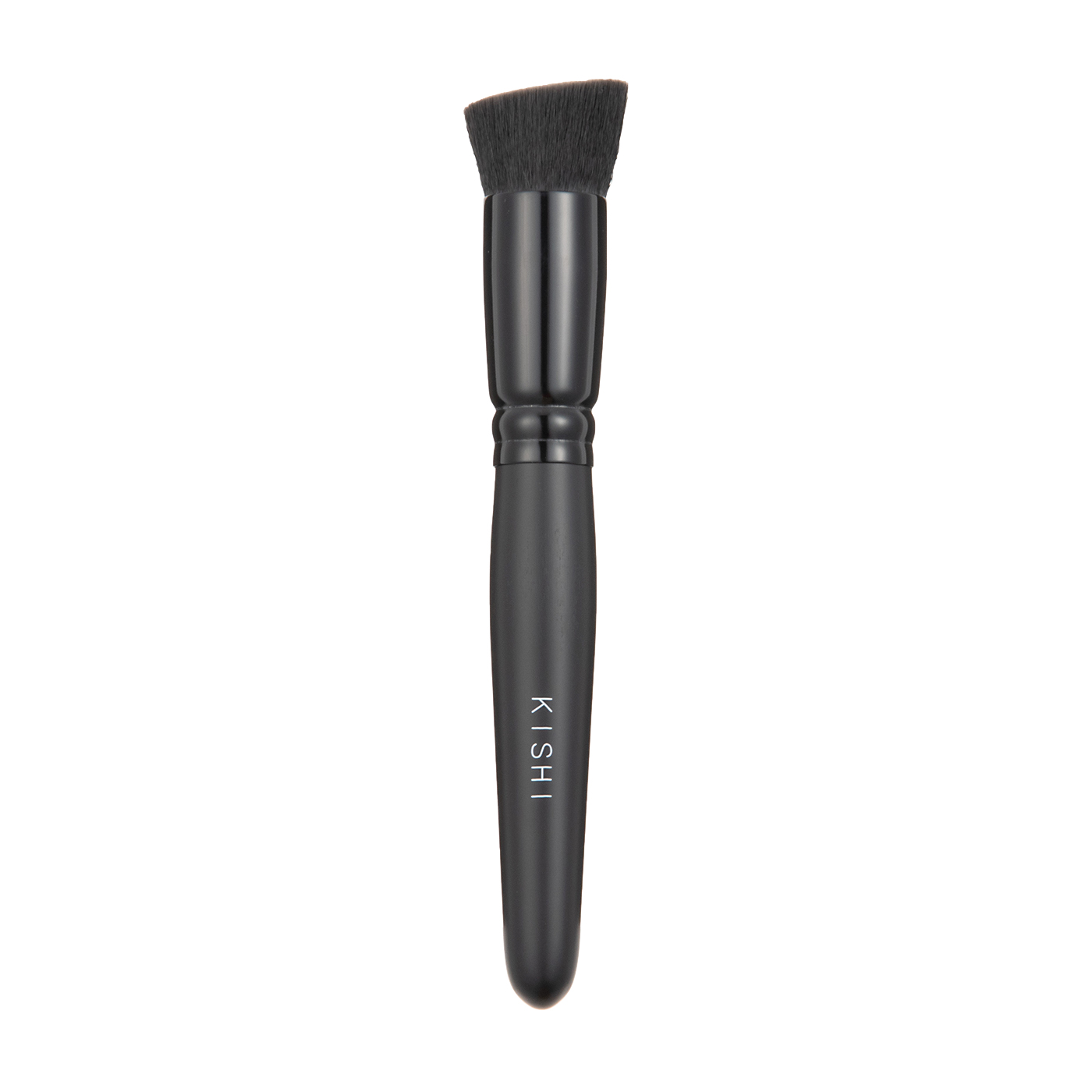 WaiWai・Landの「KISHI ファンデーションブラシ」は計算され尽くした形状で、ファンデーションのカバー力を持続させるための必須アイテムと謳うファンデーションブラシ。商品を手に取ってみると、持ち手の長さ・太さ・重さすべてがちょうどよく、毎日問題なく使用できるでしょう。毛質はとても柔らかく、ふわふわとした肌あたりで使用時に痛みはほとんど感じられません。実際にリキッドファンデーションを肌に塗布してみると、塗りたてにややムラが目立ってもあとからブラシを滑らせると、簡単に均一なベースメイクができました。ただし、顔の凹凸へのフィットのしやすさの検証では高評価にあと1歩届かない惜しい結果に。ブラシがしなりやすいのは美点ですが、ブラシヘッドがやや大きいために小鼻への密着感はまずまずとなりました。隙のないベースメイクを求める人にはやや不向きですが、ささっと軽く仕上げたい人には充分でしょう。