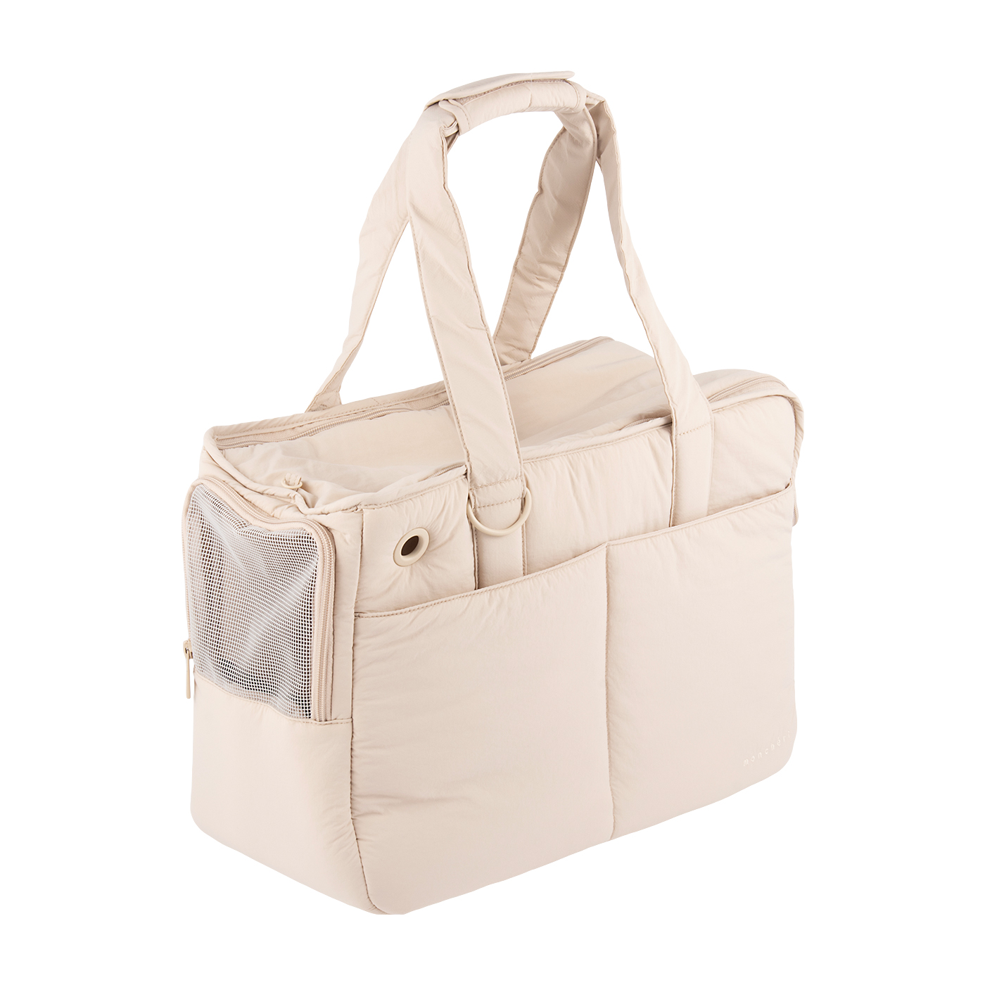 moncheriの「軽量撥水ペットトートバッグ」は、おしゃれなトートバッグのように楽に持ち運びたい人におすすめです。ソフトタイプでもちもちした持ち手は、肩にかけても滑りにくいのが魅力。クッション性があり体に当たっても痛くなりにくく、使用したモニターからは「中でペットが動いてもぐらぐらしなさそう」という声が挙がりました。上部にファスナーが付いており、バッグは自立するため愛犬を持ち上げて出し入れができます。一般的なトートバッグ型のため、お手入れが必要なパーツはバッグ本体と取り外せる中敷きのみで、生地に柔軟性があるので手入れはしやすいでしょう。内部に突起やパーツの飛び出しがないため、愛犬の安全性は申し分ありません。ロック式ファスナー搭載で中からこじ開けられにくく、飛び出し防止リードが2本ついているので脱走も防げます。一方、愛犬の快適さはやや懸念があります。上面と背面にはメッシュ素材の窓があり、風通しが良いものの、左右側面にはないため熱がこもる可能性が。長時間使用や暑い時期のお出かけには十分注意しましょう。また、やわらかな素材のため、外からの衝撃には弱め。万が一の避難用や通院用にはあまり向かないでしょう。あくまで短時間のおでかけ用なら十分おすすめできるレベルです。