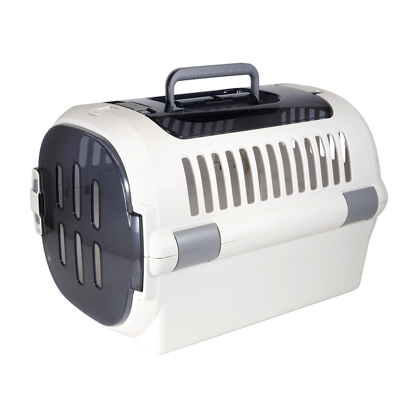 幅広いペット用品を取り扱うペティオの「2ドア スマイルキャリー」。上と前に扉があるタイプで、前面の扉を外してハウスとしても使いやすいと謳う商品です。持ち運びやすさの検証では、上下パーツの接続部分が出っ張っており、持ち運ぶときに太ももに当たり少し違和感がありました。しかし、持ち手は波状になっており、手にフィットしてしっかり握りやすい印象。短時間の持ち運びであれば問題なく使用できるといえます。前面だけでなく上面にも扉があり、キャリーに慣れていない犬も飼い主さんのタイミングで入れやすい構造です。分解できるので細かい部分まで洗いやすいのもうれしいポイント。硬いプラスチック製なので、犬の足元の安定性も高いといえます。さらに通気性の観点でも、あたたかい空気が抜けやすい上部分に通気口が多く好印象。全部で5つの通気口があり、風も通り抜けやすい構造なので通気性に大いに期待できます。また、上下パーツの接続部分はネジを締めて固定するので、持ち運びの最中にバラバラになったり壊れたりするリスクが低いでしょう。内部から開けにくいようにロック部分にカバーもついています。しかし、取っ手のパーツが内部に突起しているのが気になりました。暴れる可能性のある犬に使用する場合は注意しましょう。