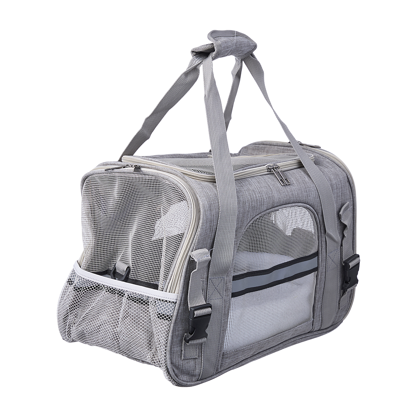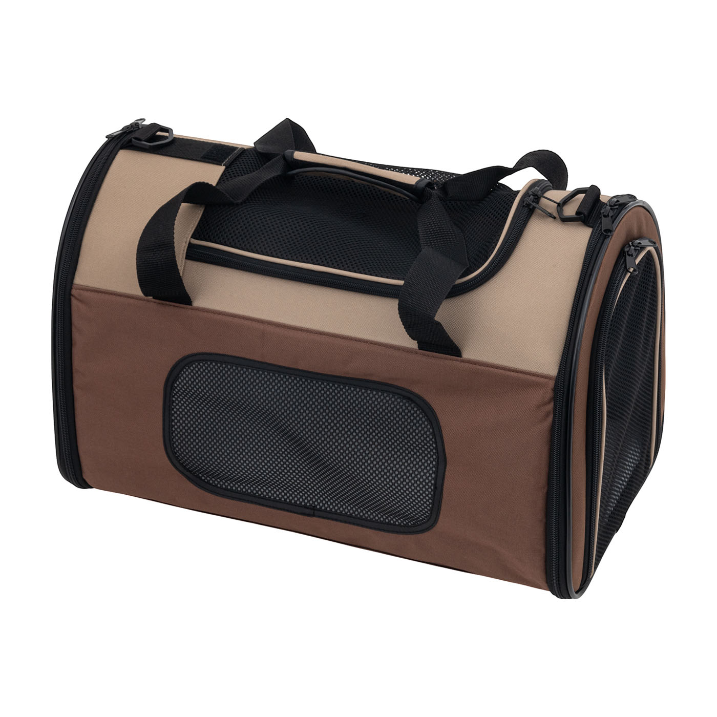 「4way ペットキャリー」は主に生活用品をECサイトを中心に販売するIkfashoniの商品。使わないときは折りたたんでコンパクトに収納できると謳っている商品です。メッシュの大きい扉が4方面にあり通気性がよく、こもった空気が抜けやすい構造といえます。加えて、それぞれの窓が大きいため、中の犬が飼い主の様子を伺いやすく、移動中にも不安になりにくいでしょう。犬を上から出し入れできる大きな扉があり、キャリーに慣れていない犬にも使いやすい印象。さらに中敷を取り外せるので、使用後の手入れもしやすいといえます。ただし、肩掛けをするとやや斜めになってしまい安定しませんでした。長い距離の移動には向いていないでしょう。近所の公園や病院などへのちょっとした移動向けのキャリーといえます。布製のキャリーバッグなため、形が歪んでしまいやすいのは気になるポイント。しかし、その分硬い箇所はないため、内部で犬がケガをする恐れは少ないといえます。また、開閉部分はロック式ファスナーなため、犬がこじ開けてしまう恐れも少ないでしょう。