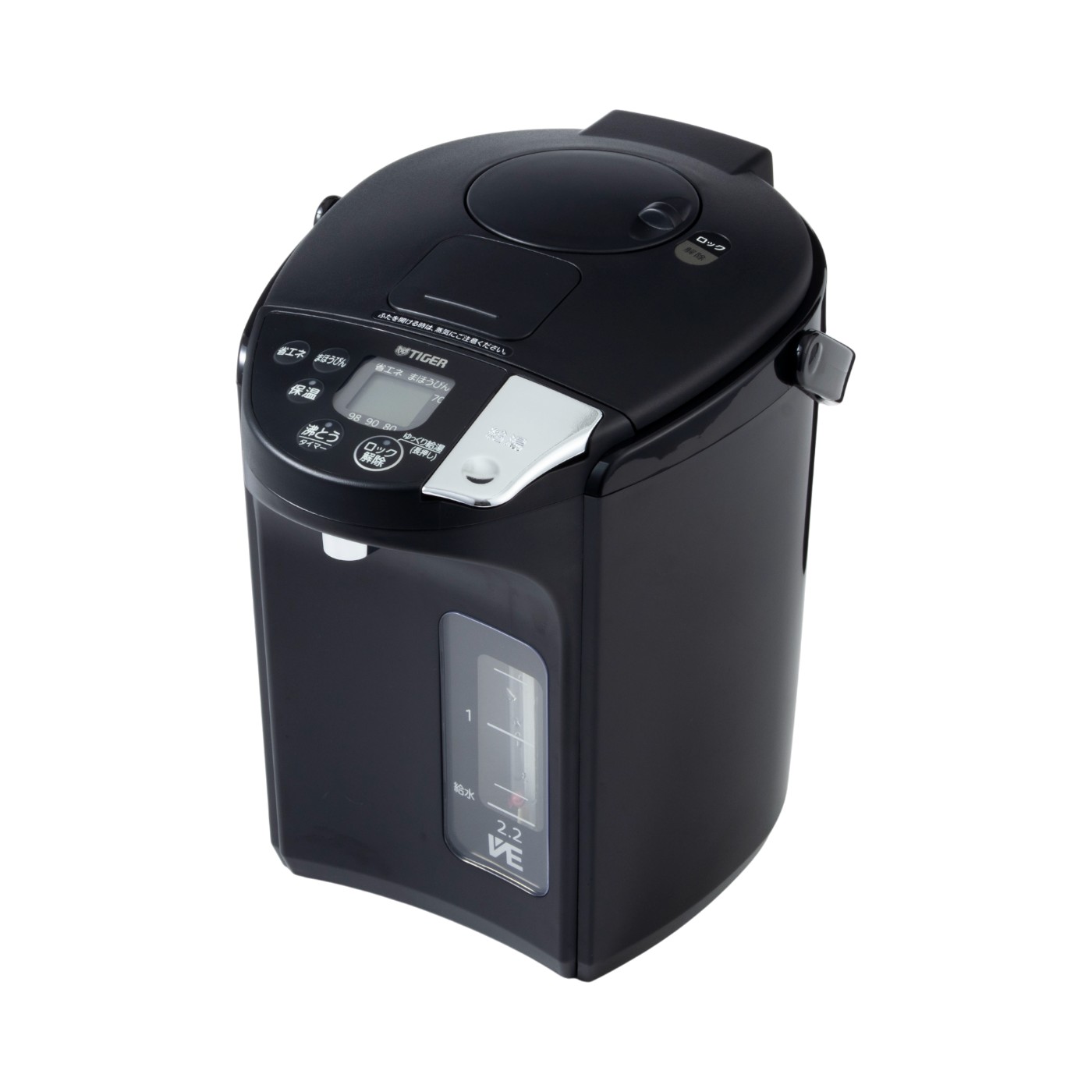 タイガー魔法瓶の「TIGER 蒸気レスVE電気まほうびん PIM-G220」は、容量2.2Lの電気ポットです。注いだお湯の量がわかる「お湯計量機能」や左右どちらからでも押しやすいワイドレバー式電動給湯、シーンに合わせて切り替えられる「たっぷり&ゆっくり給湯」など、日常的に使いやすい工夫が充実しています。インテリア性の高いスクエアフォルムでスタイリッシュなデザインも魅力です。1Lの水の沸騰時間は14分34秒とあまり短くなかったため、急いでお湯を沸かしたい人には不向きですが、保温性と安全性の高さは申し分のない結果でした。蒸気口がないためやけどの心配は少なく、熱いお湯を長時間に渡って使える状態にしておけます。目盛りに赤玉はありませんが沸騰完了は音で気づけます。。沸騰時間の速さよりも安全と使い勝手を重視する人に向いています。