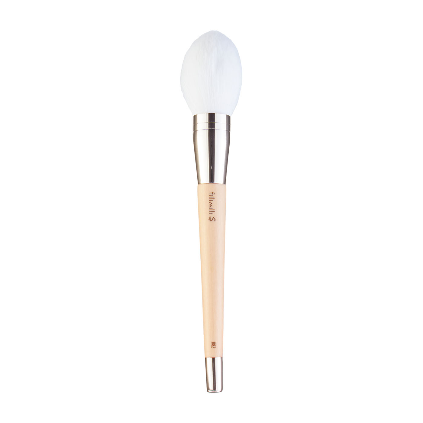 OLIVE YOUNGのFillimilli「Sシルキーパウダーブラシ 882(M)」は人工毛を使用したブラシ。肌の上にコーティングされるようにパウダーが密着して、崩れにくい仕上がりになると謳っています。ブラシを手に取ると、約21cmと非常に長い全長と約41gと重いのが難点。バランスを取りづらく、小回りもききにくいため扱いやすさを重視する人にとっては不向きなブラシといえます。人中や目の窪みなど細かい箇所へのフィット感はやや物足りなかったものの、額や頬など広い面に対しては毛幅の広いブラシがふわっとフィットしました。また実際に使用したモニターからは「肌に当てたときの感覚がとても軽い」と肌あたりについては好評を博す結果に。ブラシの性能の検証においても優秀な評価を収めました。しかし、毛量が少なめでややぼかしにくいため、チークやシェーディングなど色を重ねるツールというよりも、フェイスパウダーをたっぷり含んでのせるツールとして使うのがおすすめです。