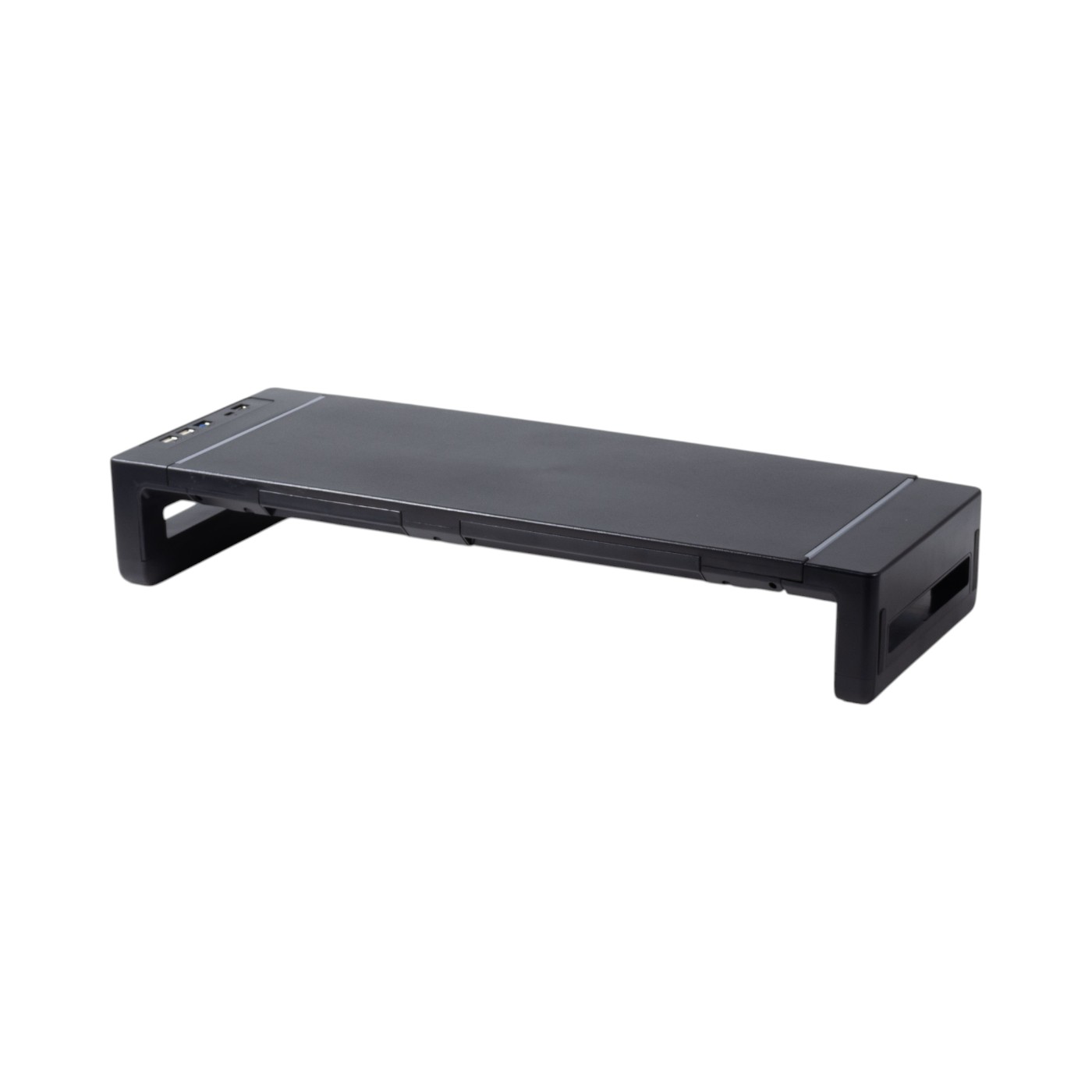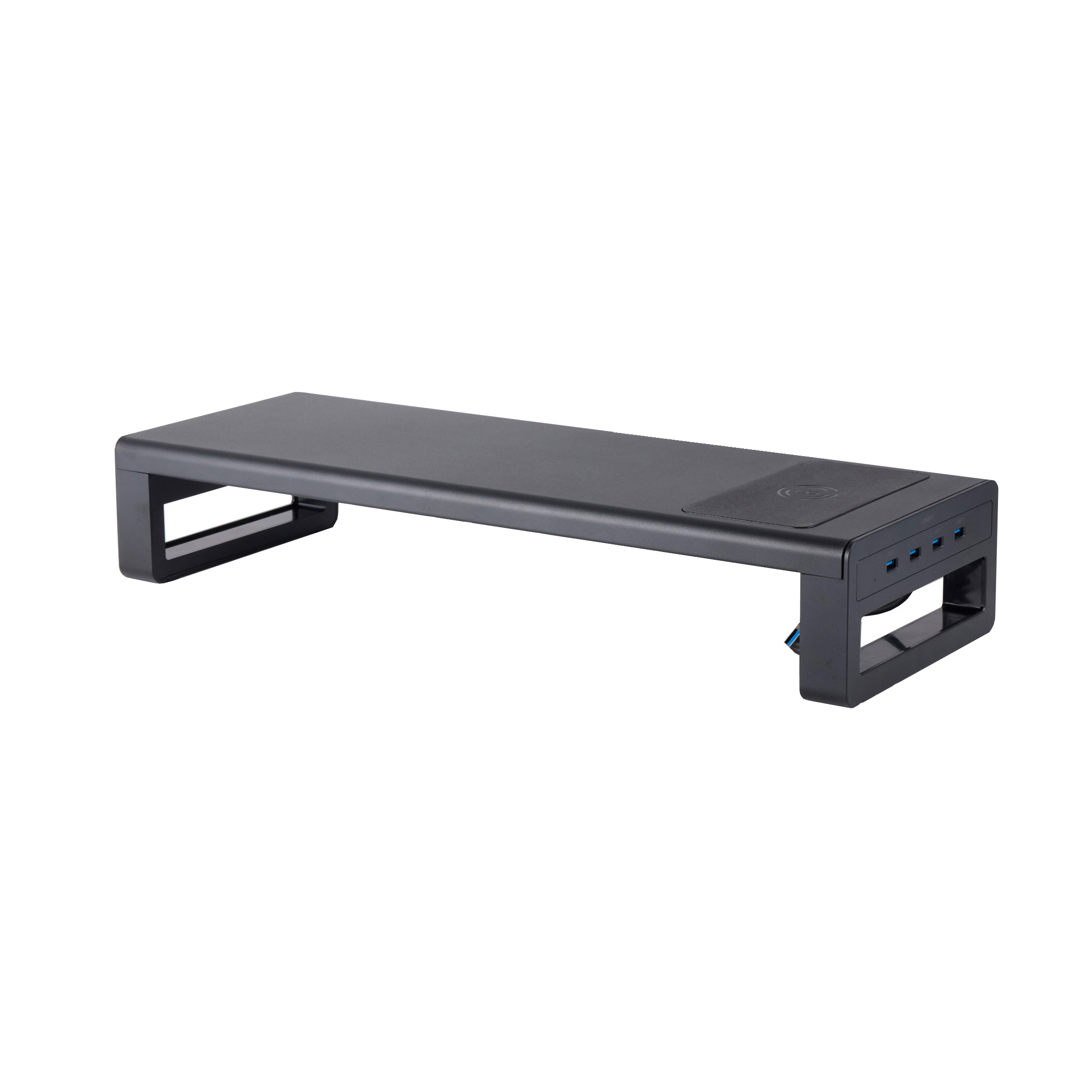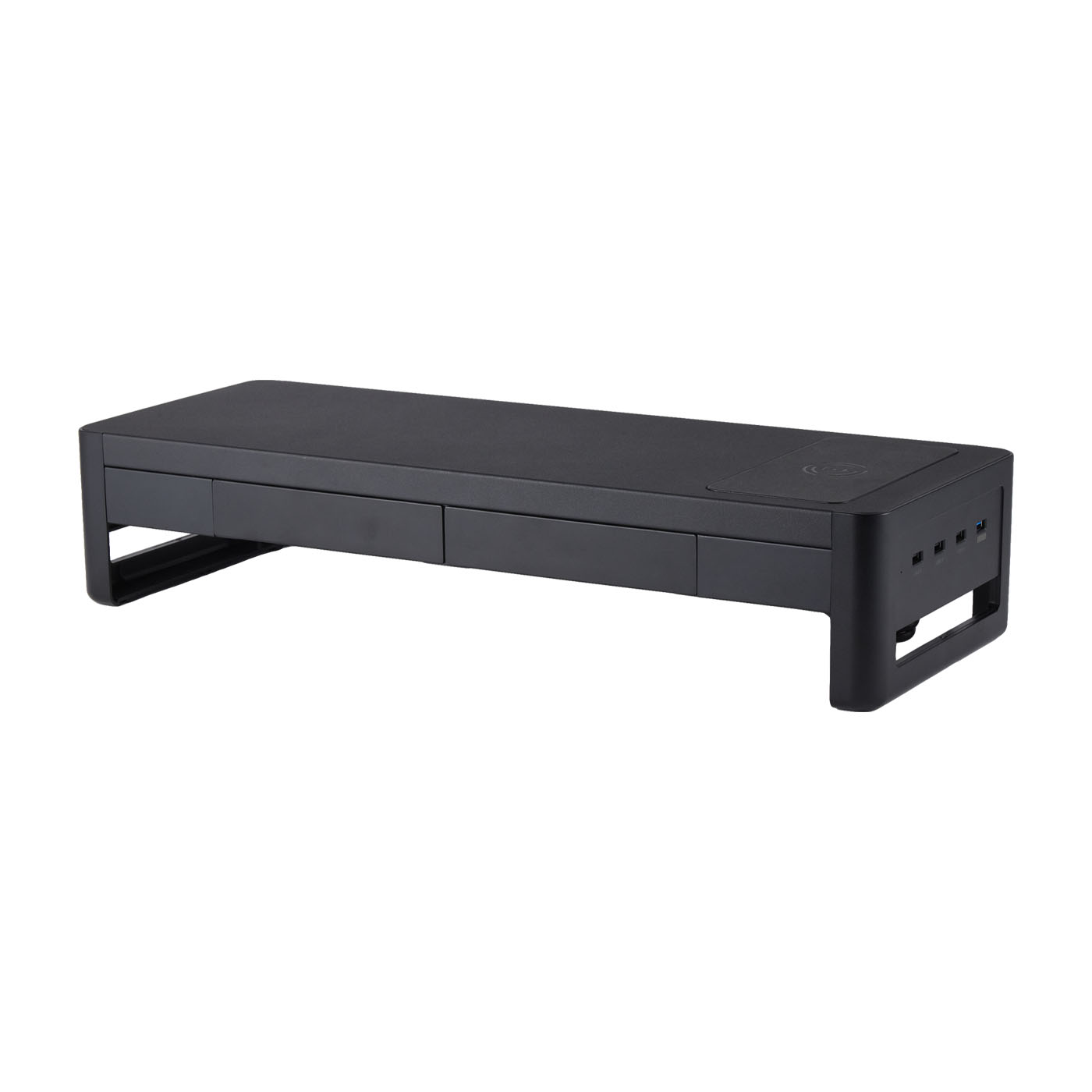 中国深センのパソコン周辺機器メーカー、VAYDEERの「モニター台」はアルミニウム合金が使われた高級感のあるデザインが特徴。iMacや27インチ以上の大型モニターに耐えられる頑丈さを謳っています。引き出しはついていない商品ですが、モニター台の内寸は48.5cmあり収納にちょうどよいサイズ。PCで作業を行わないときには、テンキーレスキーボードとマウスをモニター台の下に収納できるのでデスクをスッキリさせておくことができます。天板はアルミニウム合金でできており安定性は抜群。15kgのおもりを載せてもたわまず、今回検証した商品のなかでもトップクラスの頑丈さでした。高さは調整できないので、モニターの位置を微調整するにはモニター本体を動かす必要があるものの、小型のものからウルトラワイドモニターまで幅広いサイズものを置けるでしょう。端子も充実しており、実測値5.5Wのワイヤレス充電が1つと実測値8WのUSBポートを4つ備えています。急速充電に対応していないため充電が少なくなったスマホにはやや電力不足ですが、作業中に充電しておくにはちょうどよい強さ。そのほか、ワイヤレスイヤホンやマウスなどの小型デバイスの充電には、十分なW数を備えているといえます。価格帯はやや高めでサイズ感や安定性は十分。また、USBポートも充実しているのでデスクをスッキリさせながらも、素材に高級感がありデスクの景観を損ねないスマートなモニター台といえます。
