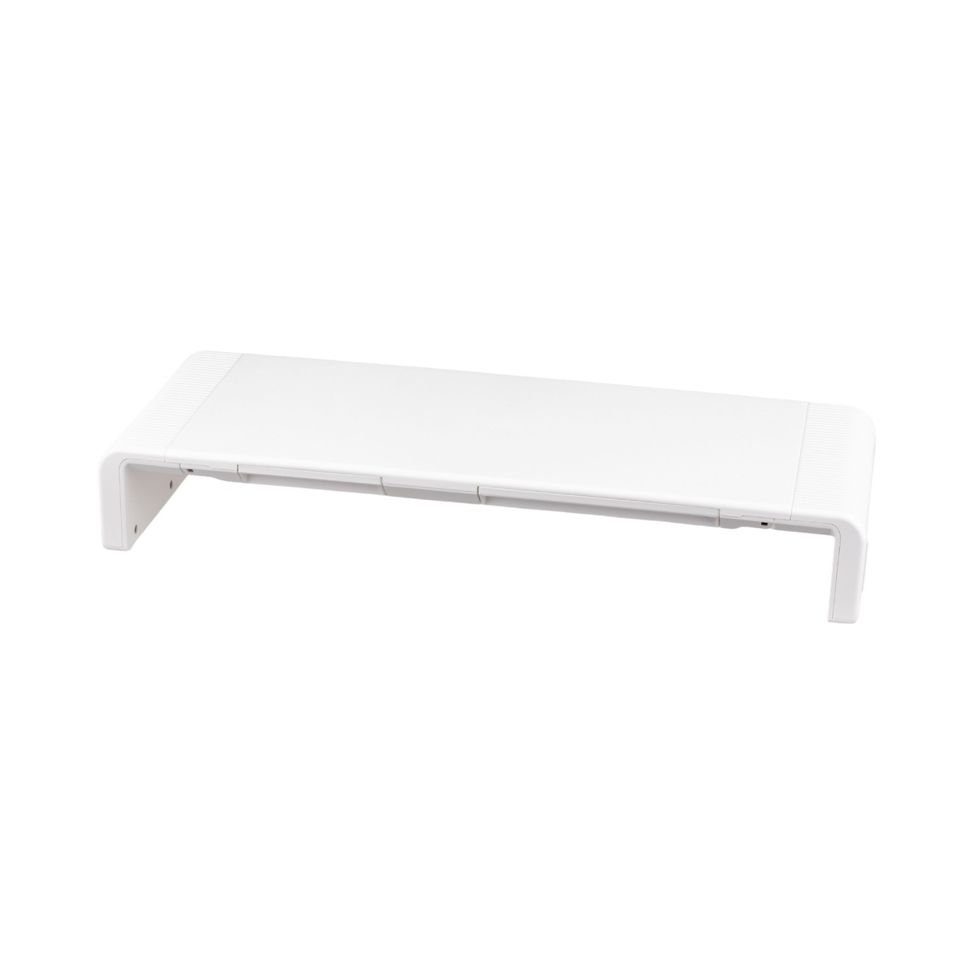 サンワサプライの「机上ラック MR-LC804W」は、デスクやディスプレイのサイズに合わせて3段階で横幅を調整できるモニター台。スマホスタンドや、付箋などが入る引き出しを備え、耐荷重は10kgです。安定性の検証では、15kgの重りを載せてもたわまず、高い安定性がありました。また、デスクとの設置面にはゴムの滑り止めがあり、多少の衝撃があってもズレにくいため、モニターを安心して載せられるでしょう。収納は、最大で内寸の高さ5.8cm、幅47.9cmとフルサイズのキーボードは難しいですが、テンキーレスキーボードならマウスと横並びで収納できるスペースがあります。設置場所に合わせて柔軟にレイアウトを変えたい人におすすめ。横幅を3段階で変えられるので机の大きさや設置するものの大きさに合わせて調整できますよ。