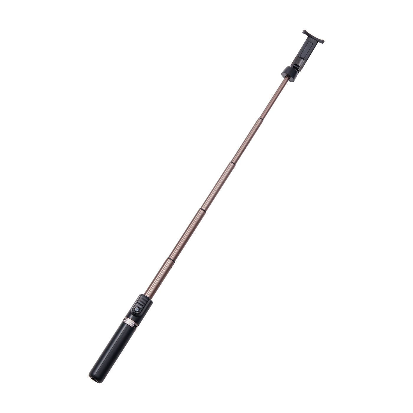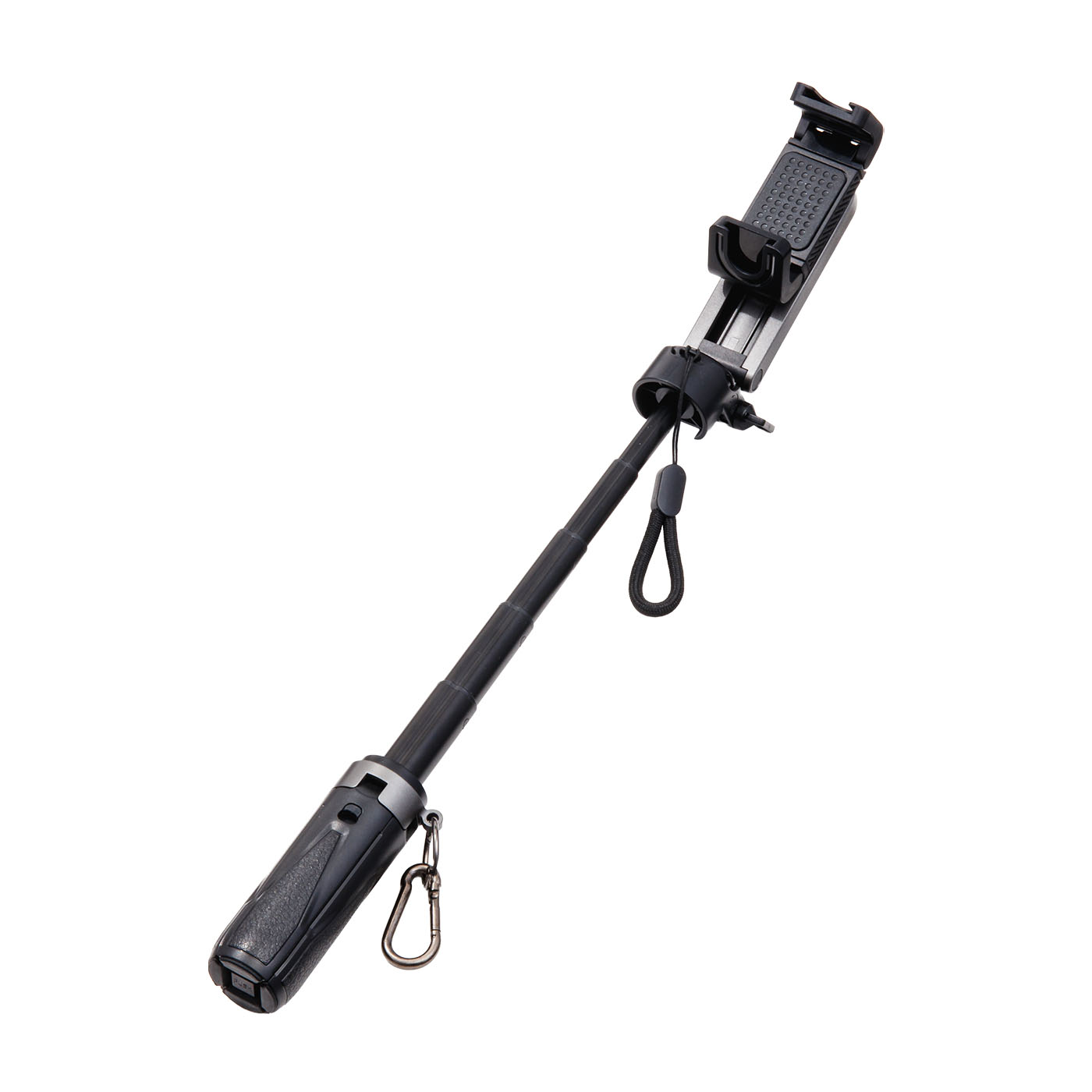 充電器やケースなどのスマホアクセサリーを販売する、テレホンリースの「ラスタバナナ 自撮り棒」。ホルダー部分が外側を向いているため、スマホの位置調整の必要なく縦横の向きを変えられます。スマホの取りつけやすさの検証では、小型のiPhoneは薄め・厚めどちらのケースを装着した状態でも着脱は簡単でしっかりスマホをホールド可能。一方、大型のiPhoneの場合はどちらのケースでもホルダーを大きく開く必要があり着脱にはやや力が必要でした。大きくても6インチ程度のスマホに使用するのがおすすめです。スティック部分は、スマホの向きを変えたり横に振ったりしてもぐらつきはありませんでしたが、重いスマホを装着して最大まで伸ばすと少ししなりました。撮影時はスマホのサイズや重さによって伸ばす長さを調整するのがよいでしょう。ホルダー部分は、爪をたたんでホルダーを倒す一般的な作りで、難しい操作は必要ありません。着脱可能なBluetoothのシャッターリモコンが付属。タイマー設定の必要がなく、自撮りはもちろん遠隔で撮影する際に活躍します。ホルダーのつけ根にはカメラネジが搭載されているため、ネジに対応したカメラや撮影アクセサリーを取りつけ可能です。三脚にした際は、最大風速12m/sまで倒れませんでした。耐荷重も850gと高く、スマホの大きさや重さに関わらず安定した撮影が可能でしょう。本体の重さは約150gと軽量で、収納時のサイズは19.7cmとやや長め。長さはやや気になるものの、軽量であるため持ち運びやすい商品といえます。