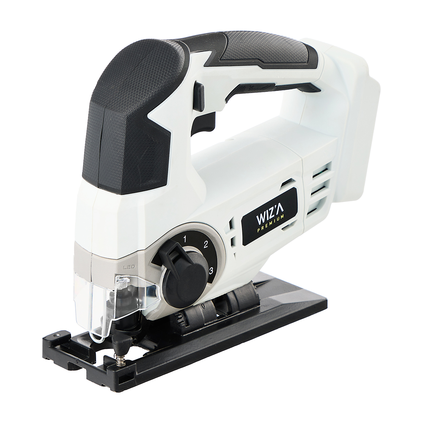 ビバホームやムサシといったホームセンターチェーンを全国に展開するアークランズのプライベートブランド、WIZ'Aの「充電式ジグソー」。電流が2.0Ahの別売りのバッテリーは、WIZ'A18Vシリーズの電動工具と共通して使用できます。切断のしやすさの検証では、それほど時間もかけずにスムーズに2×4材を切断できました。一方、オービタル機構を最大で稼働させると断面がかなり粗い印象。電動工具の初心者である一部のモニターからは、振動が気になるという声もありました。2.0Ahのバッテリー装着時の本体の重量は約2.6kgで、ベースプレートにも厚みがあるため木材の上に置いたときの安定感がある一方で、重いため細かい操作がしにくいという声も。ハンドルはやや太めで、握りやすさの評価も分かれました。手が小さい人は少し疲労感を覚えるでしょう。オービタル機構は4段階で調節できますが、それ以外ではスピードを調節できないため、材料の硬さやサイズ、下書きの細かさに合わせてスピードを変更することは難しいといえます。また、稼働ロック機能もなくトリガーを引き続ける必要があるため、長い幅のカットの際は疲れやすいでしょう。そのほかも切断をサポートする機能は物足りない印象でした。